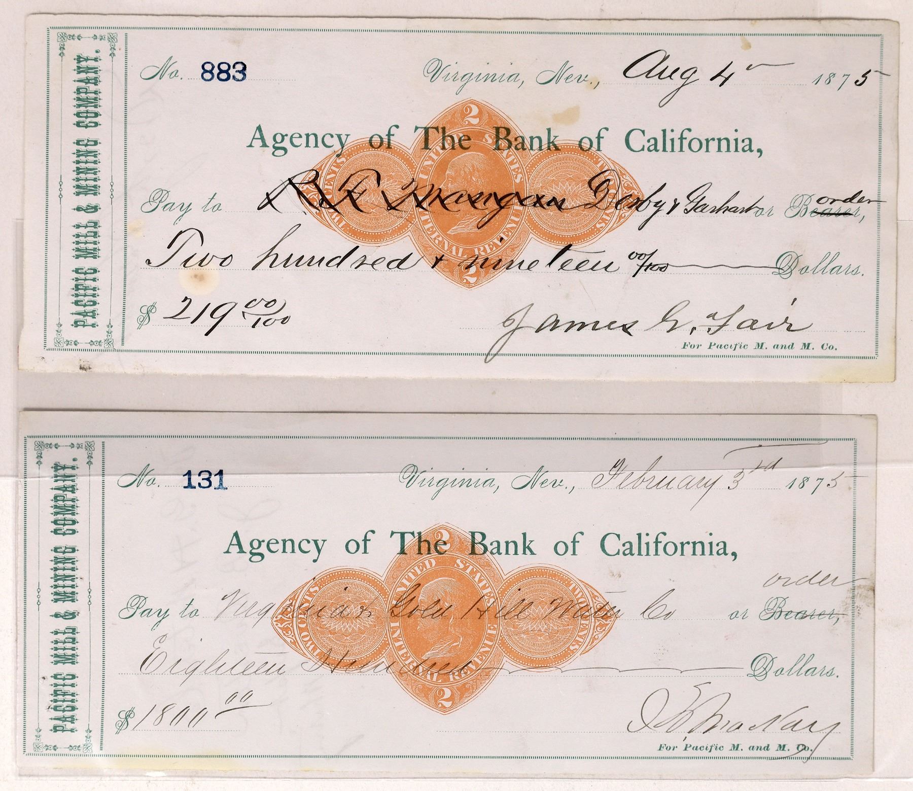 Lot of 2. Each is on the check form with green print and RN-D imprinted revenue. 1) No. 131, issued to the Virginia & Gold Hill Water Co. in 1875. Signed by John Mackay. Rare to see Mackay's signature on this check type. 2) No. 883, issued to Derby & Gerhart in 1875. Signed by James G. Fair. Both checks have light stains. The Pacific Mill & Mining Company was established by the "Bonanza Firm" in the 1870s - a partnership formed by Irish immigrants, John W. Mackay, James G. Fair, James C. Flood, and William S. O'Brien, men who later became known as the "Silver Kings" or "Bonanza Kings" of the Comstock. The Bonanza Firm challenged the broad control Ralston and Sharon exercised over the Comstock Mines, backed by the Bank of California, by joining their finances in various stock operations and transactions, leading to the formation of a new group of mining corporations. These included Hale & Norcross, Gould & Curry, Consolidated Virginia, and others. In their campaign against the "Comstock Bankers" the Bonanza Firm adopted tactics similar to those Ralston, Sharon and the Bank of California used the previous decade to gain control over the Comstock; The Bonanza Firm purchased all the major mine suppliers, and in 1877 the group established an "independent" mill, the Pacific Mill and Mining Company, which was wholly owned by the "Bonanza Firm" and incorporated under the Laws of California. The company owned a number of other mills in the Comstock area including the Bacon Mill, Brunswick Mill, California Mill, California Pan Mill, Consolidated Mill, Mariposa Mill, Morgan Mill, Occidental Mill, Omega Mill, Rhode Island Mill, Trench Mill, and the Woodworth Mill/Ditch. Later, the Bonanza Firm successfully defended monopoly accusations and shareholders claims of fraud involving the Pacific Mill and Mining Company, by arguing that their business practices represented "industry custom."