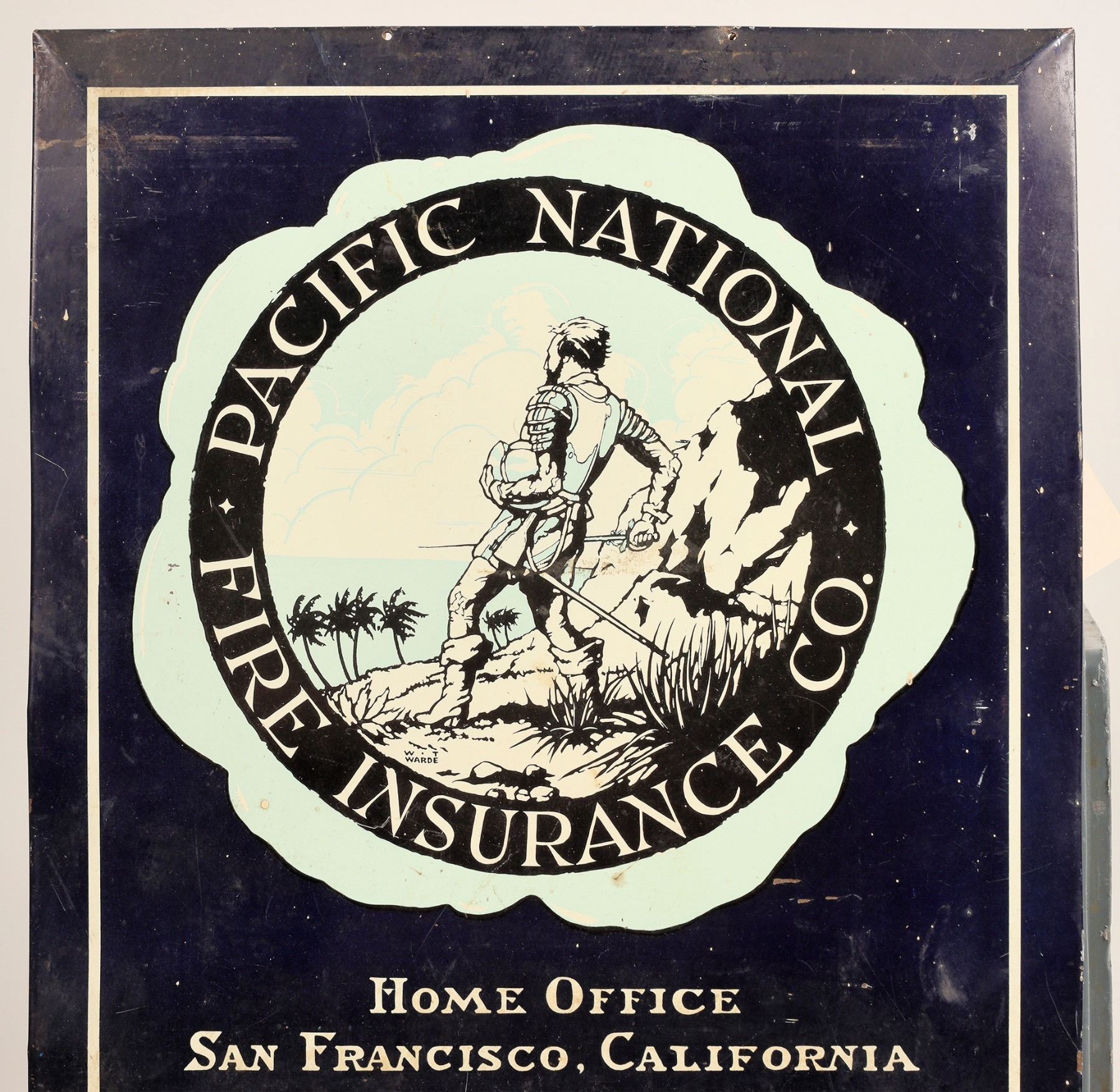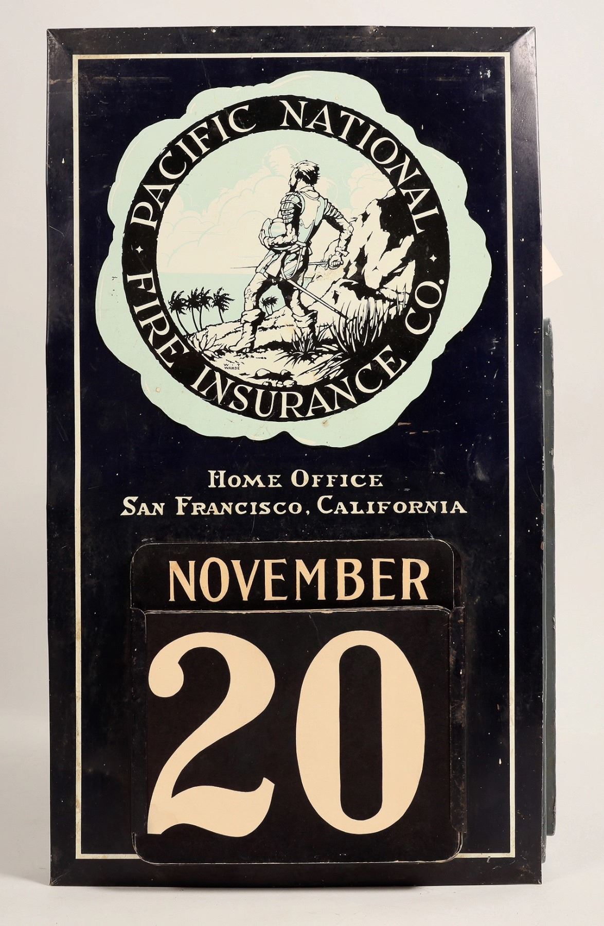 A Pacific National Fire Insurance Company metal calendar sign. It measures 19"x 11" and has cards with month and days that are inserted into a pocket for display. The sign's in great shape for its age. In good condition and quite a unique design.