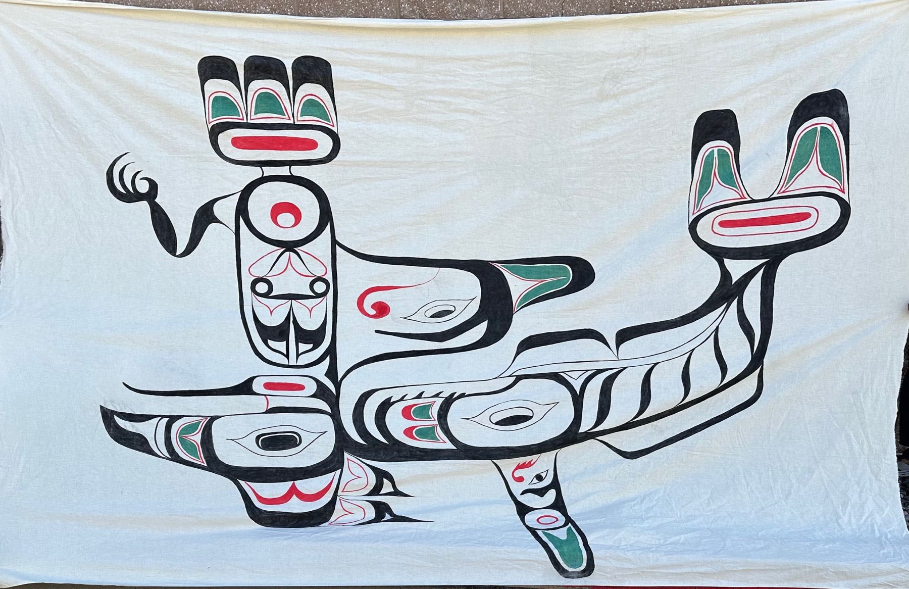 This Pacific Northwest art banner depicts an Orca whale and the Sea Hawk. More images may be recognized by the trained eye. It measures roughly at 9 ft. X 12 ft. on artist quality canvas. It was likely used for a meeting place, a banner without grommets, or a large table runner. It is colored by marker pen. Please see photo for details. In very good to excellent condition.