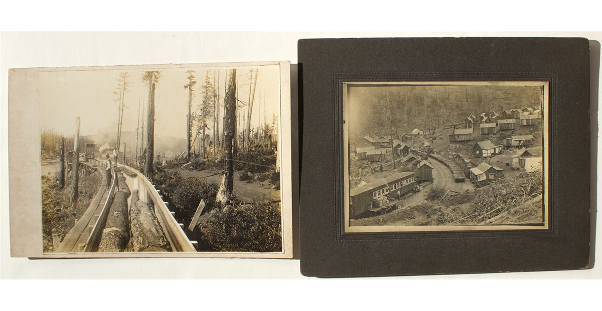 Lot of two. 1) Mounted photograph showing lumber camp with locomotive parked next to stacks of wood. Many small cabins on the hillside above the tracks. No photographer identified. Photograph is 5" x 7" on 8" x 10" cardstock. Medium contrast. 2) Another mounted photograph. Shows two men standing near a logging flume chute. Reverse has pen writing: "Log chute down to Saw Mill off of Wind River Wosh." Photograph is 6.5" x 8.5" on 6.75" x 9.75" cardstock. No photographer identified. Medium contrast with some scratches.