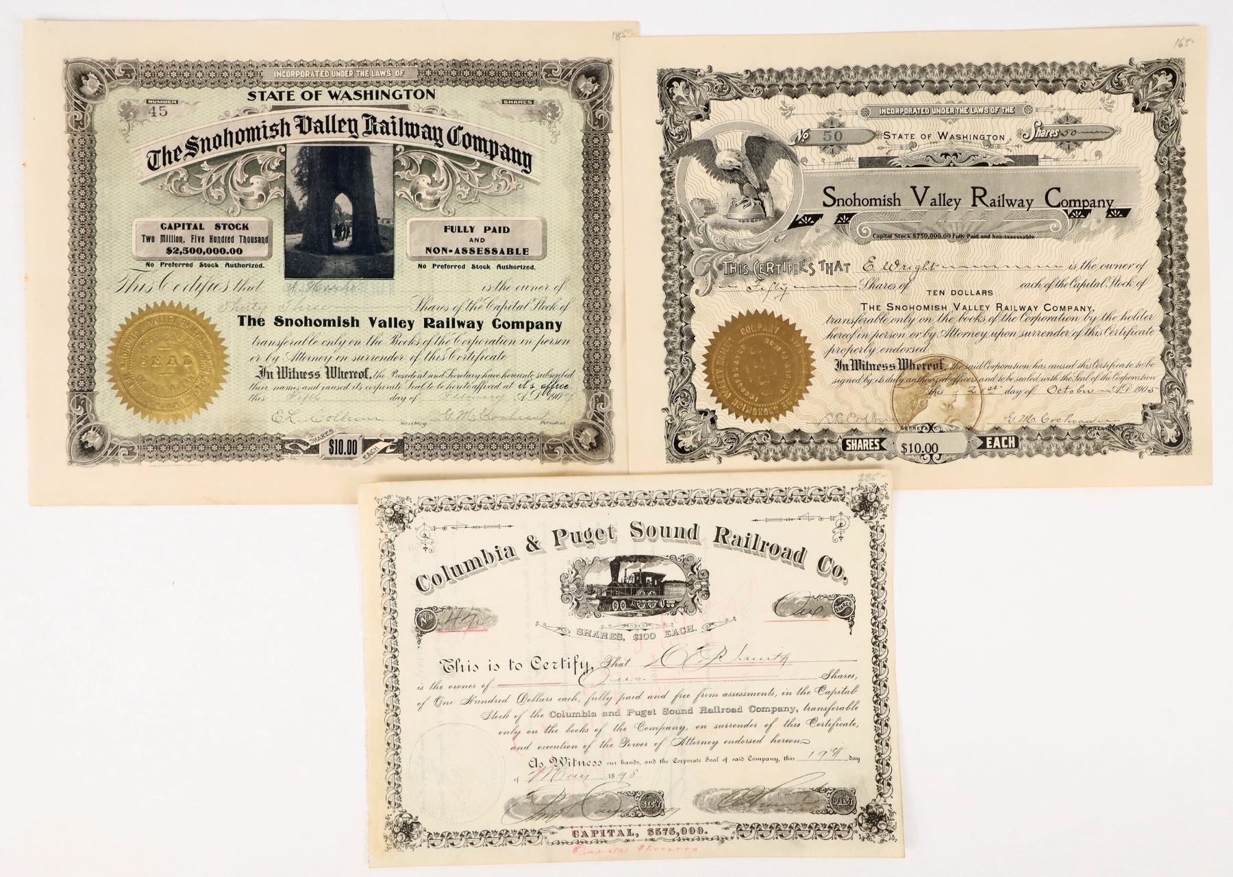 Lot of 3 different. 1-2) Two different stocks for the Snohomish Valley Railway Company. 1905 and 1907. The 1907 has a great vignette of people walking through a giant tree. 3) Columbia & Puget Sound Railroad Company. Issued in 1898, pen cancelled. Locomotive vignette. Henry Villard, owner of the Oregon Railway and Navigation Company, bought the Seattle and Walla Walla Railroad and Transportation Company in November 1880 and reorganized it as the Columbia and Puget Sound Railroad (C&PS), intending to connect the two in eastern Washington.
