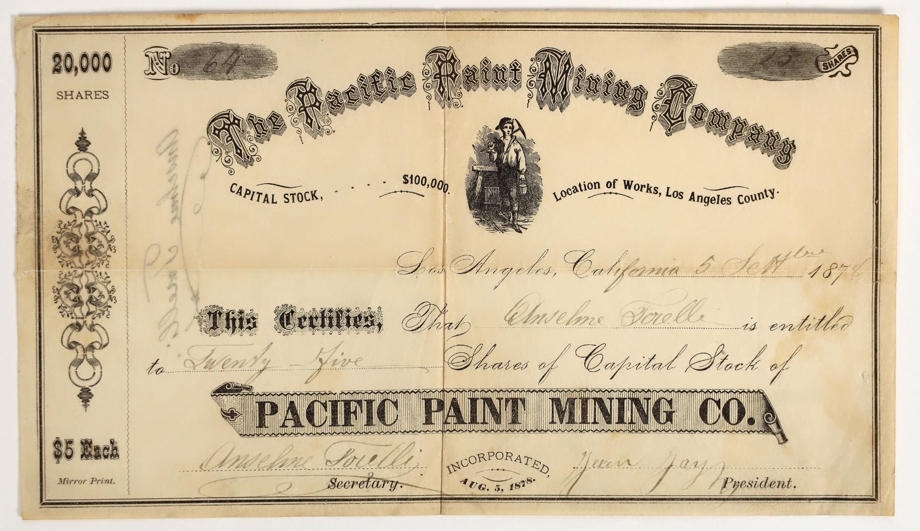 "Location of Works, Los Angeles County" (printed under title). . This company operated a mine producing paint ingredients just north of Redondo, Los Angeles County. No. 64, issued for 25 shares to the company secretary in 1878. Also signed by president Jean Jay. Not cancelled. Black border and print with prospector vignette. Mirror Print. Deep folds, few tears, toning/soiling. 5.25 x 9.25"
