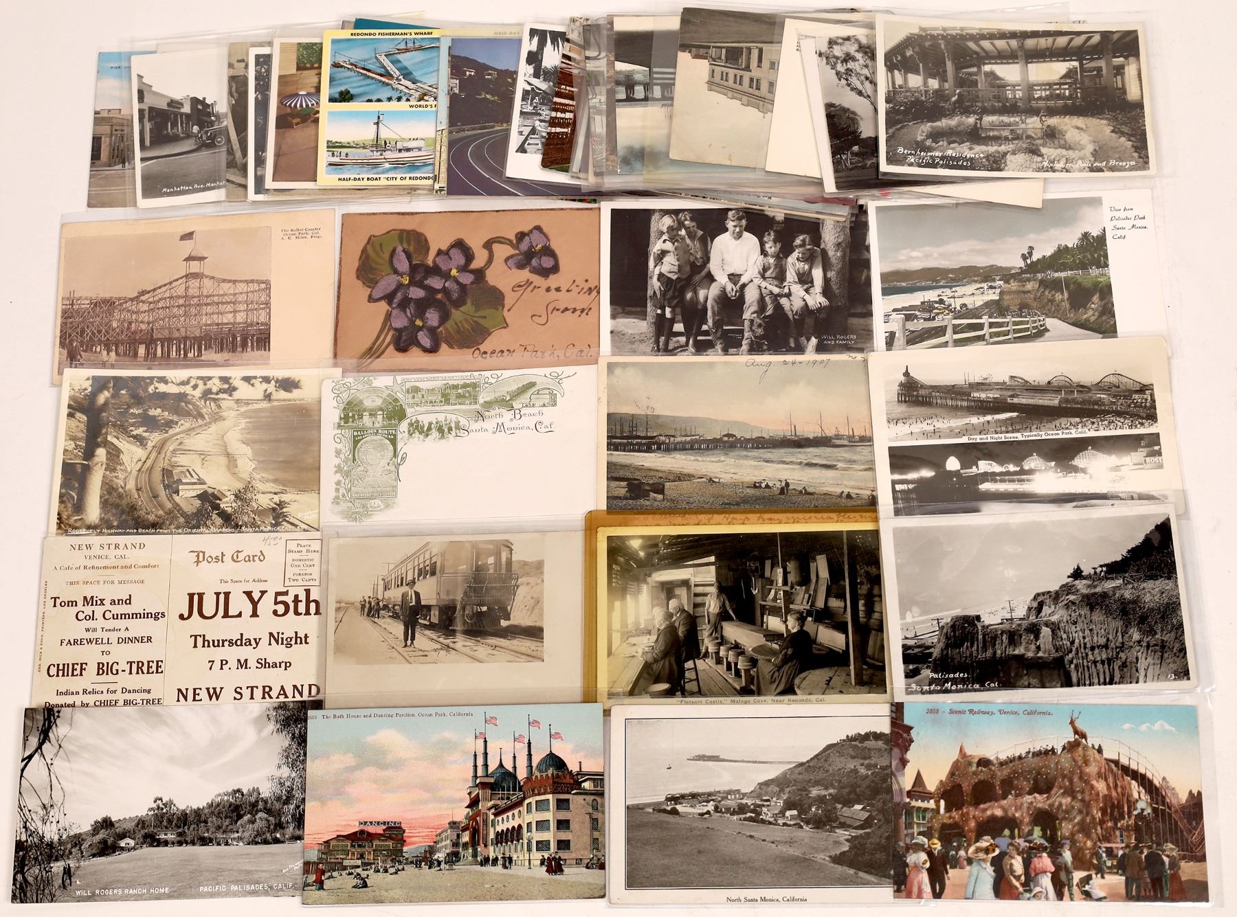 Lot of about 54: 14 RPC's, 22 older postcards and 14 newer cards. RPC's include Will Rogers & Family, Palisades cliff/beach scene, Church of Santa Monica, Moonstone Beach with Trolley, Santa Monica Beach overview. Older cards include a Private Mailing Card from the North Beach of Santa Monica, and a No Split Back of the Ocean Park roller coaster. Also, a fabulous Flotsam Castle at Malaga Cove. Newer cards include Miramar swimming pool, Santa Monica Ocean Front, Venice New Strand farewell dinner to Chief Big Tree with Tom Mix, South Sea Island at Pacific Ocean Park leather 3d greetings from Ocean Park. Plenty of beach scenes, street views and overviews.