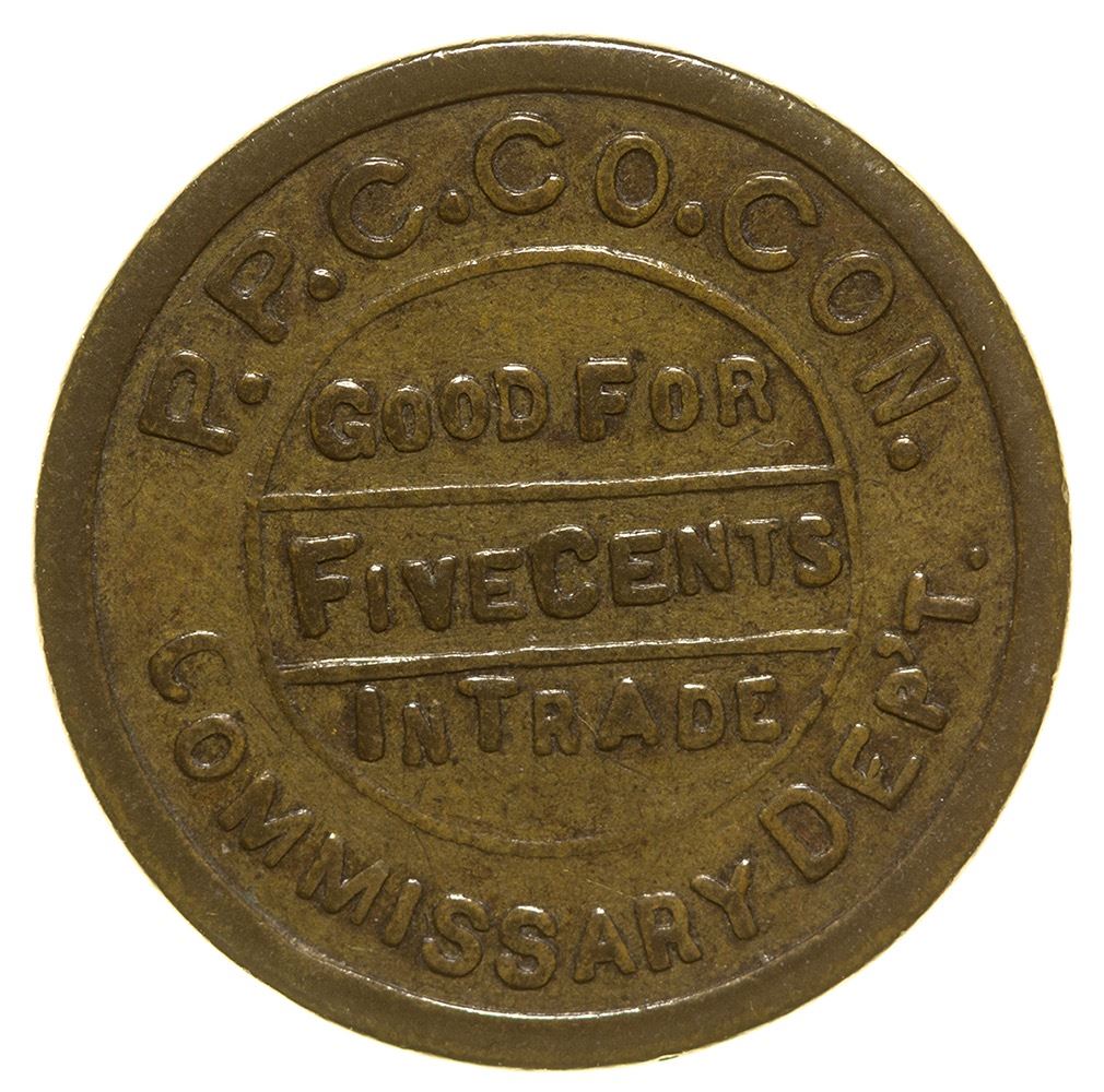 P.P.C.Co.Con. / 5c / Cement Cal. // P.P.C.Co.Con. / GF 5c IT / Commissary Dept. Location is near Fairfield. Remains of the foundation of this plant can be seen on the hillside. City: Cement State: California Date: c1903-1928 ID# 45104