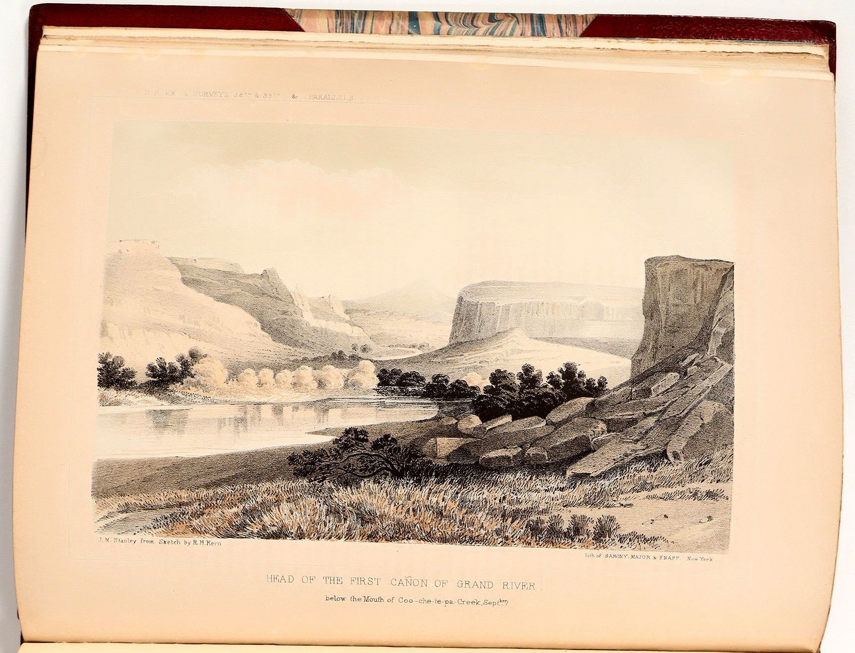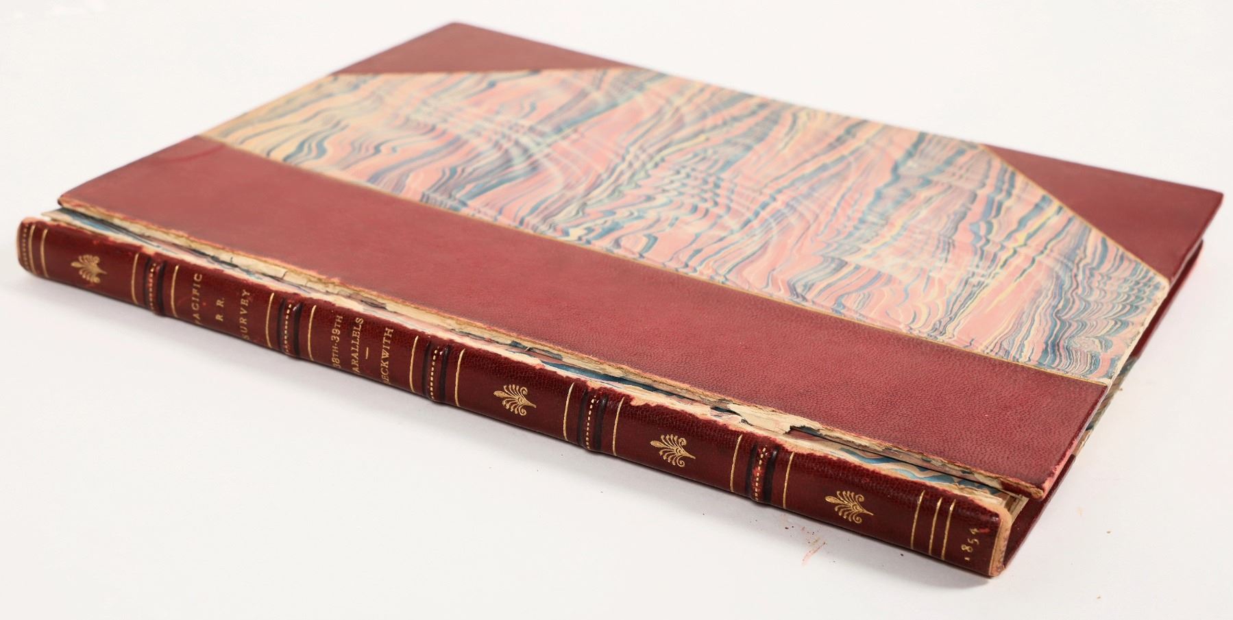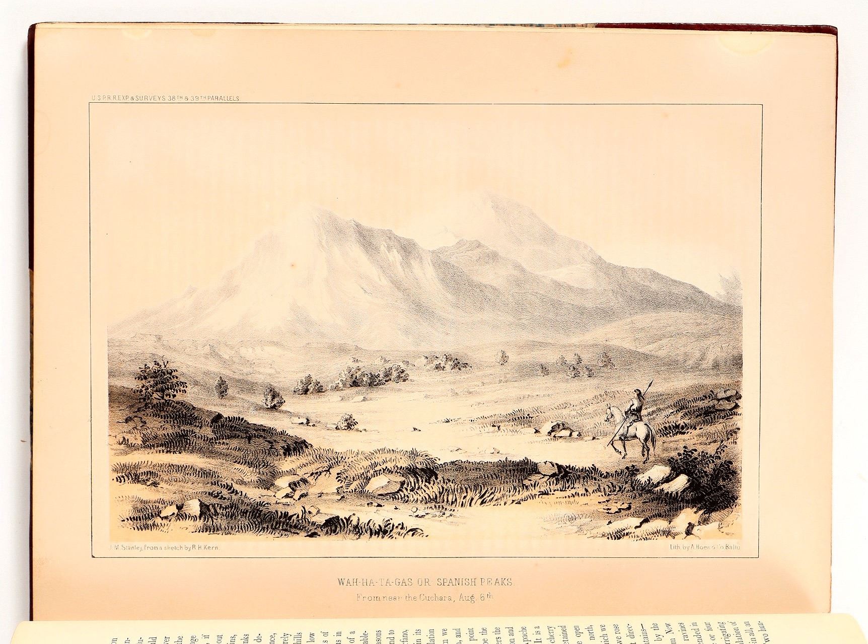 Pacific R.R. Survey 38th And 39th Parallels by LT. E.G. Beckwith, 1853-54, hardbound, 128 pages. War Dept. publisher, Third Artillery. 14 color plates of countryside explored. Reports on the exploration for a railroad route from the Mississippi river to the Pacific Ocean, covering all aspects: geology, zoology, botany, climatology and encounters with Native peoples. No maps. Front cover is separated from spine.