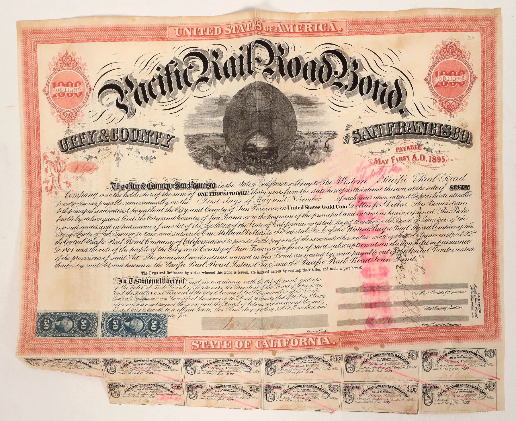 1865 Pacific Rail Road of San Francisco bond with 2 adhesive 50c Washington revenue stamps.