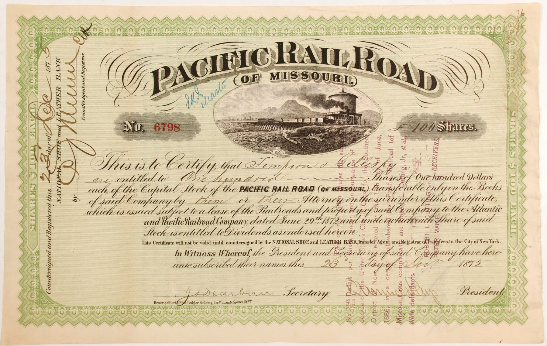 I/C #6798 Timpson & Gilespie 100 shares 1873. Signed by President Daup? "On July 4, 1851, ground was broken at St. Louis on the Pacific Railroad, the predecessor of the Missouri Pacific Railroad. The first section of track was completed in 1852; in 1865, it was the first railroad in Kansas City, after construction was interrupted by the American Civil War. In 1872, the Pacific Railroad was reorganized as the Missouri Pacific Railway by new investors after a railroad debt crisis. Because of corporate ties extending back to the Pacific Railroad, Missouri Pacific at one time[when?] advertised itself as being "The First Railroad West of the Mississippi". Missouri Pacific was under the control of successful but controversial New York financier Jay Gould from 1879 until his death in 1892. Gould developed a system extending through Colorado, Nebraska, Arkansas, Texas, and Louisiana. His son George Gould inherited control upon his father's death, but lost control of the company after it declared bankruptcy in 1915.[1] The line was merged with the St. Louis, Iron Mountain and Southern Railway (SLIMS) and reorganized as the Missouri Pacific Railroad in 1917. Missouri Pacific later acquired or gained a controlling interest in other lines in Texas, including the Gulf Coast Lines, International-Great Northern Railroad, and the Texas and Pacific Railway. MoPac declared bankruptcy again in 1933, during the Great Depression, and entered into trusteeship. The company was reorganized and the trusteeship ended in 1956." from wikipedia. Prag Collection