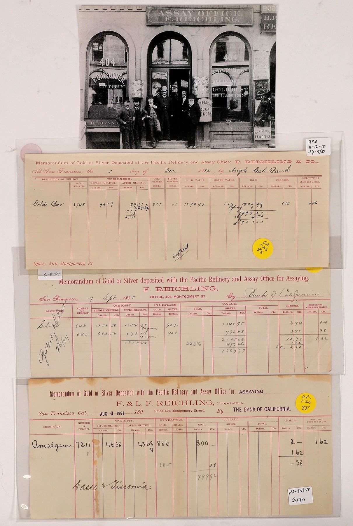 Lot of 4. Includes 3 different assay memorandums and a modern print of a 19th-century photo. Pacific Refinery & Assay Office, 404 Montgomery St., San Francisco. In the early 1870's, Riehn & Hemme centralized their business to the 404 Montgomery location, where they stayed for another decade, until selling out to F. (Francis) Reichling about early 1882. Francis Reichling had previously been an assayer in Volcano according to a listing in Langley's Pacific Coast Business Directory for 1867, p. 435. This same reference lists his brother P. (Peter) Reichling as an assayer in nearby Jackson. Later F. Reichling is listed in Langley's San Francisco Directory for 1872, p. 548 as F. Reichling & Co., proprietors of the Pacific Gold and Refinery on the corner of Main and Harrison with an office at 334 Montgomery. 1) 1882 receipt for a deposit by the Anglo Cal. Bank for one gold bar, 99 ounces. Lists office at 400 Montgomery St. 4 x 11" 2) 1885 receipt for a deposit by the Bank of California, Gillespy & Childs. According to the 1890 San Francisco directory, they were agents for Daggett Ore Sampling Company (of Daggett, California), Yuma Mill and Mining Co (El Rio, CA), and Glencoe Cons. Mining Co. Clearly they were brokering mine, mill and assay transactions for a number of Western mines at this point. Two silver deposits, 1800 ounces total. 4 x 11" 3) 1891 deposit by the Bank of California. This form lists F& LF Reichling as proprietors. One deposit of amalgam, 886 gold fineness, by Dasso & Tiscornia, who ran a stage out of San Andreas in the late 1880's and early 1890's. The 1886-87 McKenney's Pacific Coast Directory showed they had a general merchandise store in San Andreas also. 5 x 11" Folds, stains. L. F. Reichling was F. Reichling's son and was listed as the secretary of the Kennedy Mining Company (Amador County) in the 1891 San Francisco Directory. 4) 5 x 7" modern copy of a photo showing the Assay Office with six men posing. This is a rare group that has receipts for gold, silver, and amalgam! San Francisco California Franklin Collection