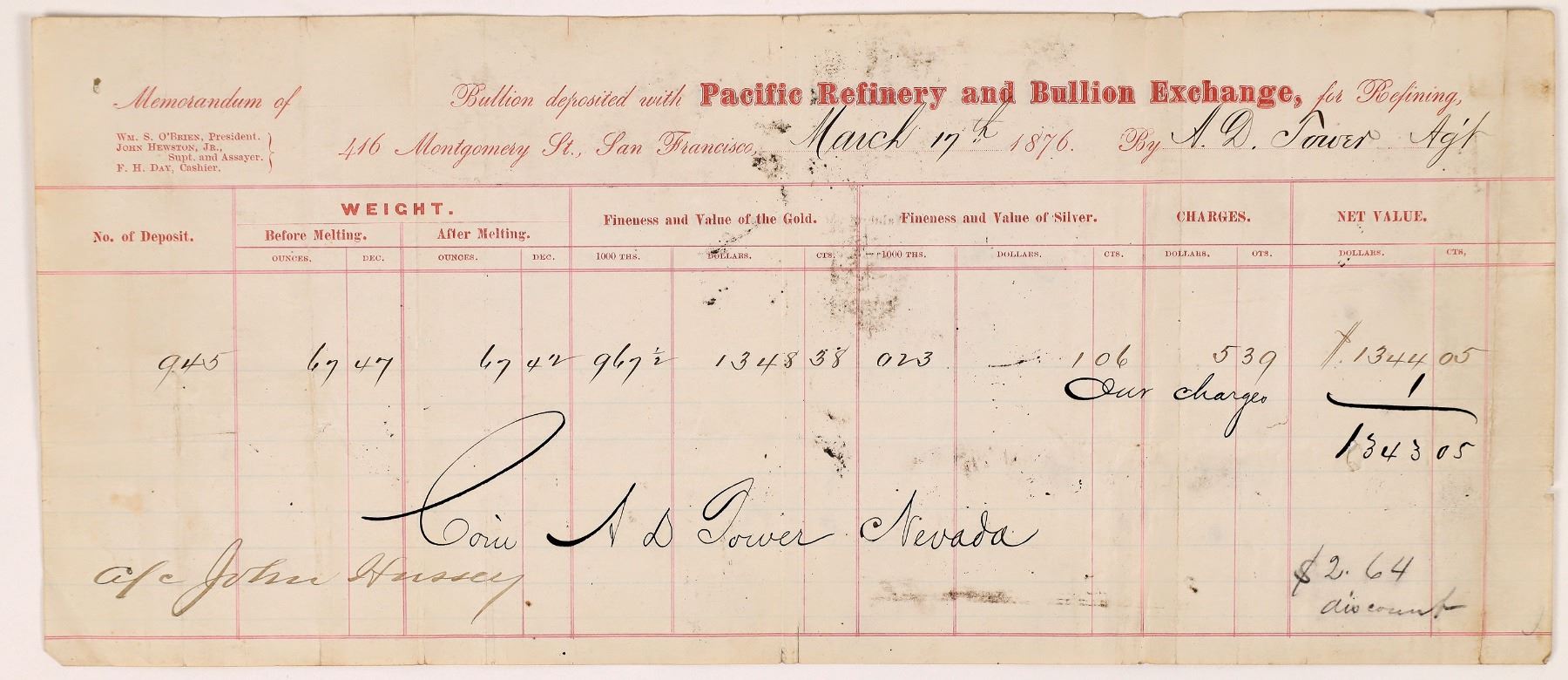 March 17th, 1876 bullion receipt for deposit by AD Tower (a Wells Fargo agent in Nevada City). 67 ounces, 969 gold fineness. Bottom states "Coin AD Tower Nevada" on a/c John Hussey (a mine owner in Nevada County). 5.25 x 12" Red print. Many folds, soiling (especially on reverse)._x000D_