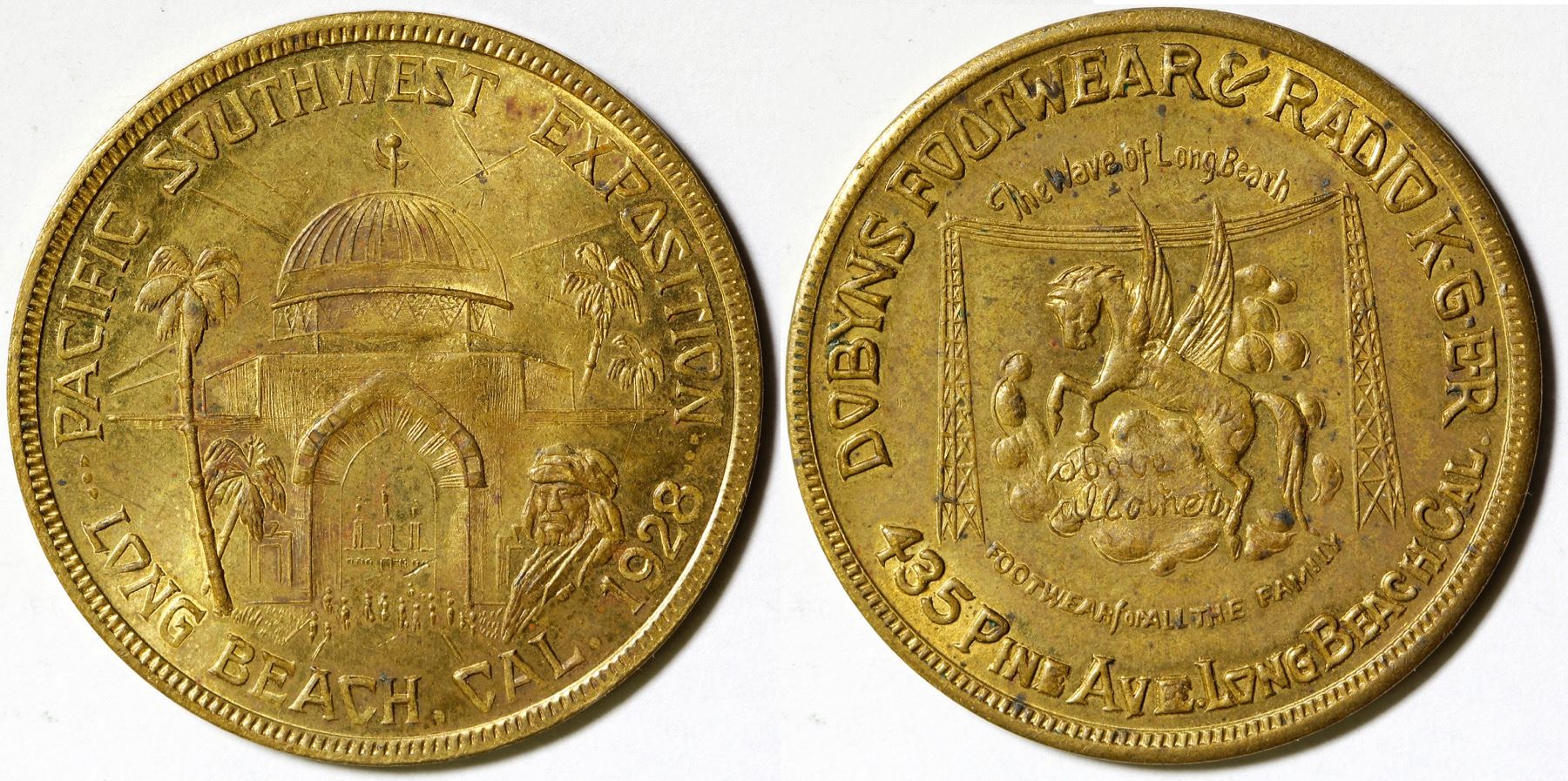 Obv.: Pacific Southwest Exposition / Long Beach, Cal. / 1928; Rev.: Dobyns Footwear & Radio KGER / 435 Pine Ave. Long Beach, Cal. Br., rd., 31 mm. Daniel Manassillian Collection. State: California City: Long Beach Date: 1928 HWAC# 83937