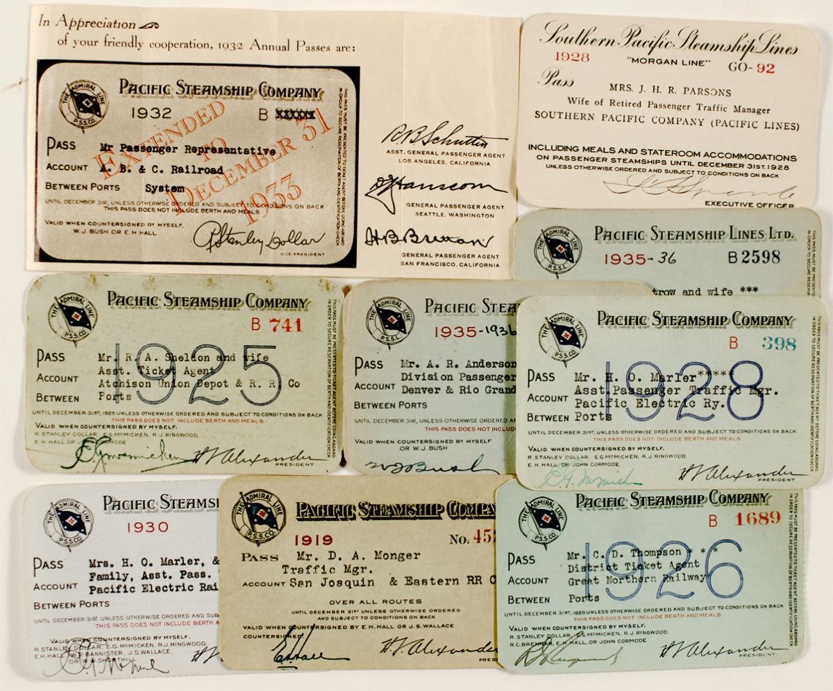 Sixteen passes total. Pacific Steamship Co.: 1919, 1925, 1926, 1928 (2), 1929, 1930,1931 (2), 1932 (3), and 1935 (3). Also a document announcing that the 1932 passes have been extended to 1933. One 1928 pass from Southern Pacific Steamship Lines. Prag Collection City: State: United States Date: 1919-1935 ID# 22604