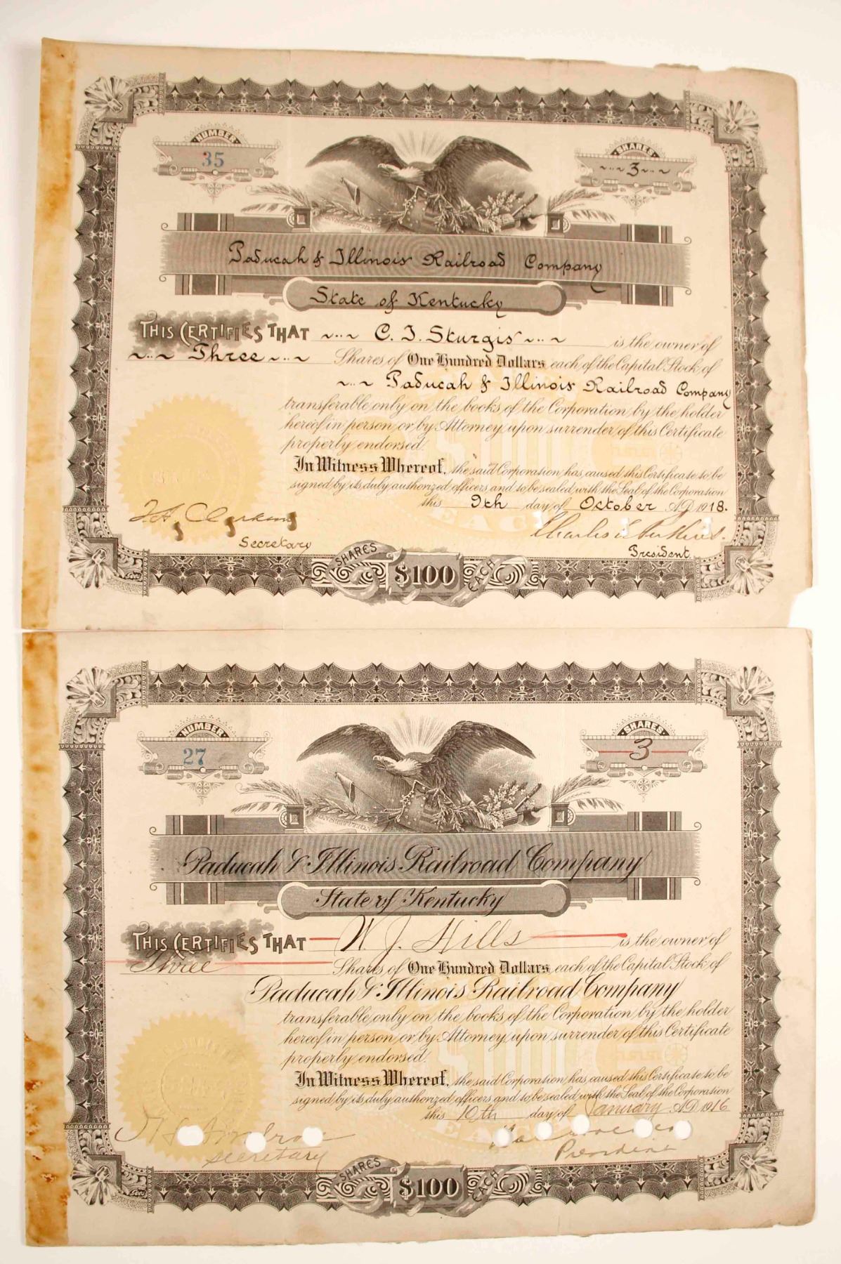 2 certificates total; 1 is from 1918 and the other is from 1916. Both are black and white with some staining/small tears. Printed by Goes. Both i/c. Prag Collection. City: State: Date: 1900's HWAC# 79622