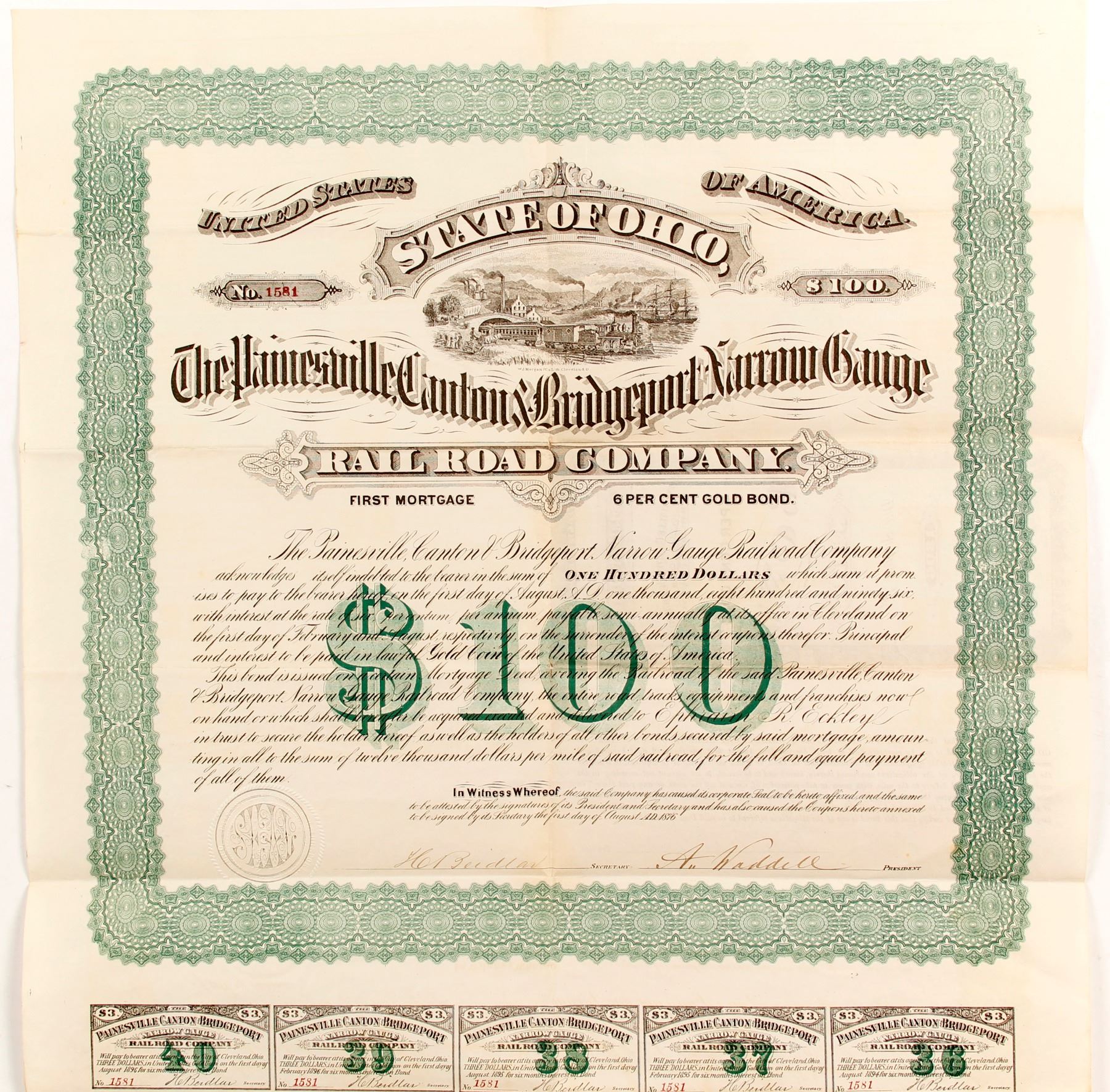 Unlisted #1581 $100 6% gold bond signed by President Waddell. All coupons intact. Operated from 1875-1880. Prag Collection. State: City: Date: 1876 HWAC# 84217