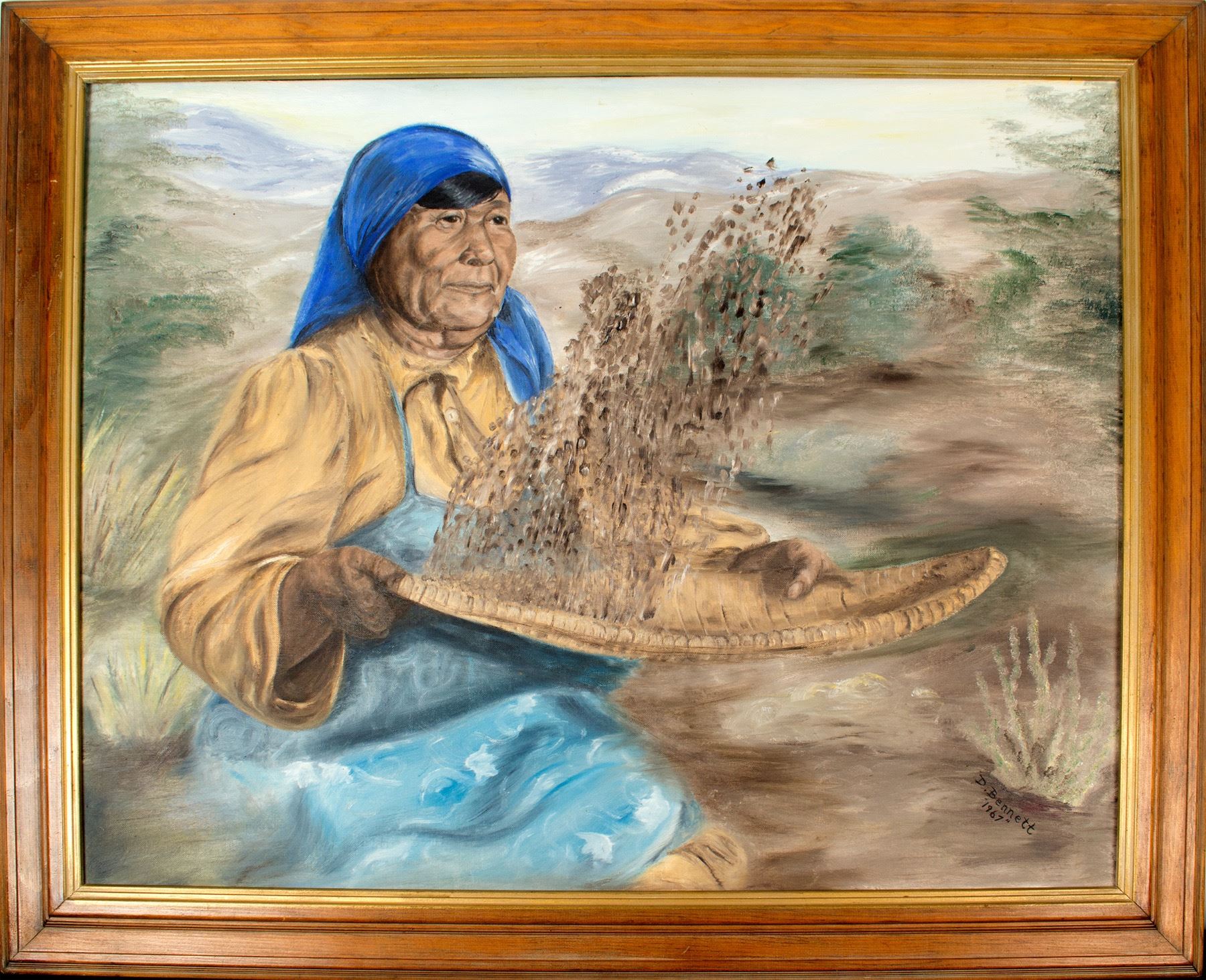 Winnowing the Harvest Woosie George, Paiute, Stillwater, Nevada. Acrylic painting by Delores Bennett. Framed, 29" x 35". State: Nevada City: Carson City HWAC#: 43427 Date: 1967