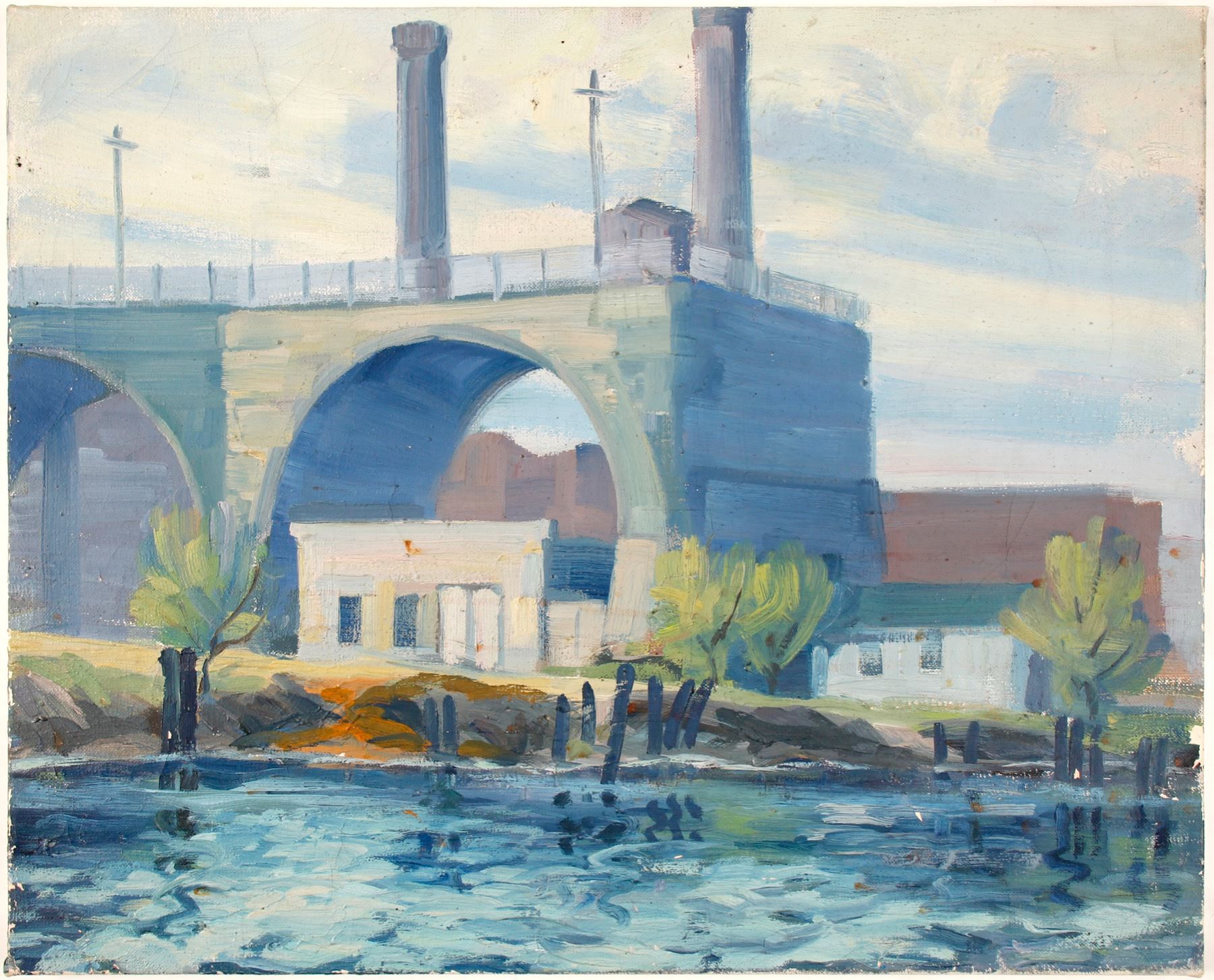 Beautiful oil painting by Nevada artist J. Laverne Lane. This is a structure of masonry, trees, & water. Very soft colors. Has slight damage (paint coming off at edges). Unframed.19.5" x 15.75". City: State: Nevada Date: early 1900's HWAC# 79167