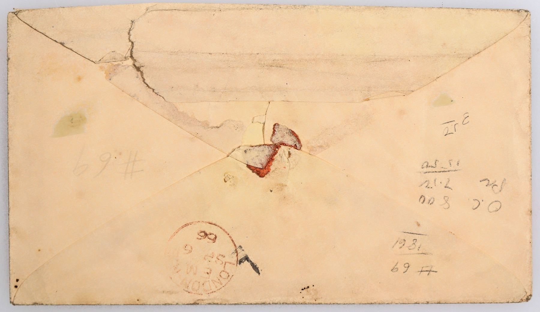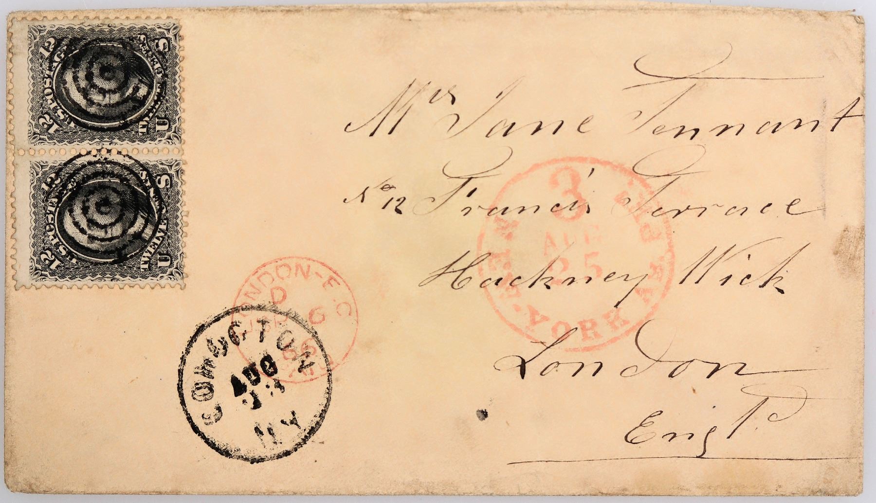 Pair of uncut #69 black 12 cents tied by black target cancels and matching Cohogton AUG 23 1866 NY circular date stamp. Red New York exchange date stamp of Aug 25 to London England and red London Sep 6 '66 receiving marks on face and back of cover. Pencil writing on back.