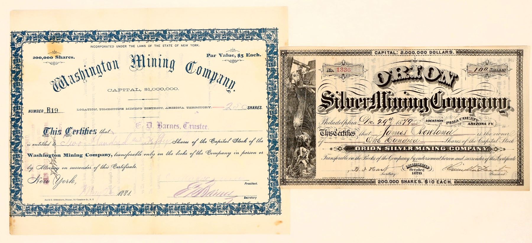 A pair of stock certificates from two Arizona mining companies: the Orion Silver Mining Company (cert. dated 1879, located in Pima County) and the Washington Mining Company (cert. dated 1881, located in Tombstone Mining District). Both certificates are issued and have been signed by the secretary and president of their respective companies; they also each bare a faint embossed company seal in the upper right corner. The Orion certificate has a detailed vignette of a mining scene. Both are uncancelled. Overall good condition, with some staining on the Washington certificate.