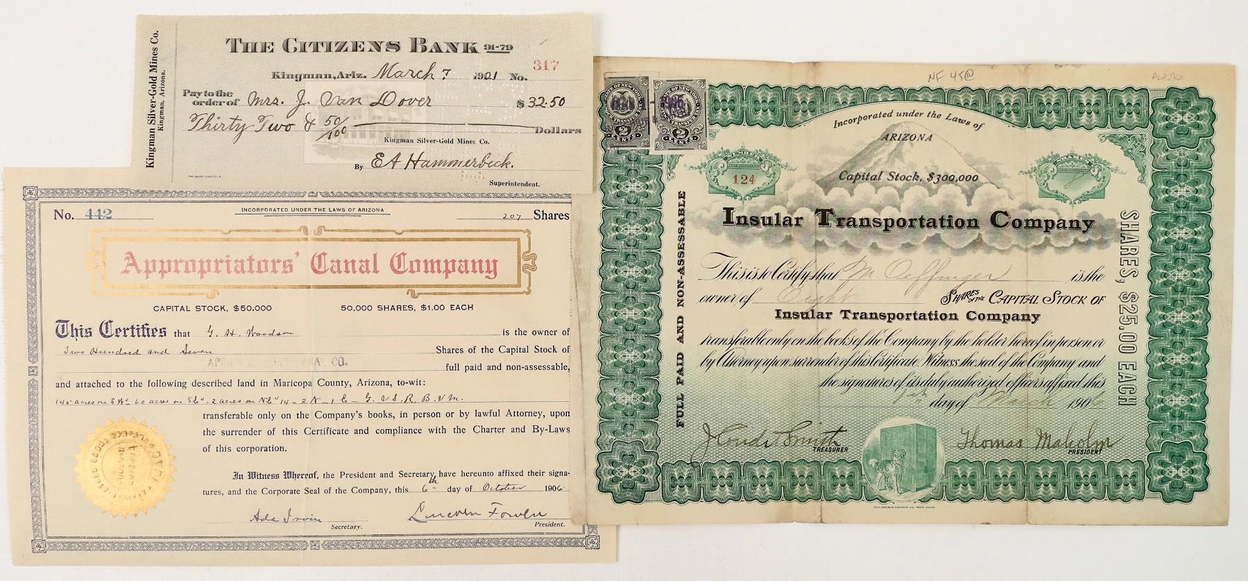 Two stock certificates for shares in two Arizona companies, the Appropriators' Canal Company and the Insular Transportation Company. The certificates are both dated 1906. Each bears the seal of its respective company, as well as the signatures of secretary and president. The Insular Transportation certificate has an engraved vignette of a mountain.