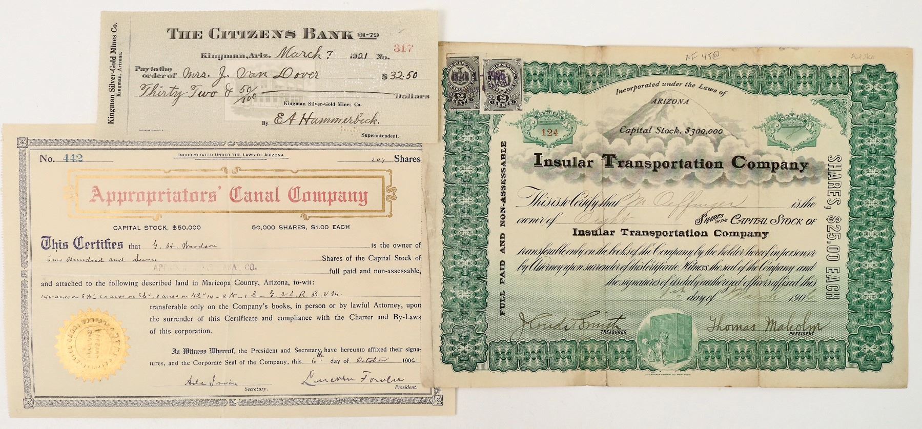 Two stock certificates for shares in two Arizona companies, the Appropriators' Canal Company and the Insular Transportation Company. The certificates are both dated 1906. Each bears the seal of its respective company, as well as the signatures of secretary and president. The Insular Transportation certificate has an engraved vignette of a mountain.