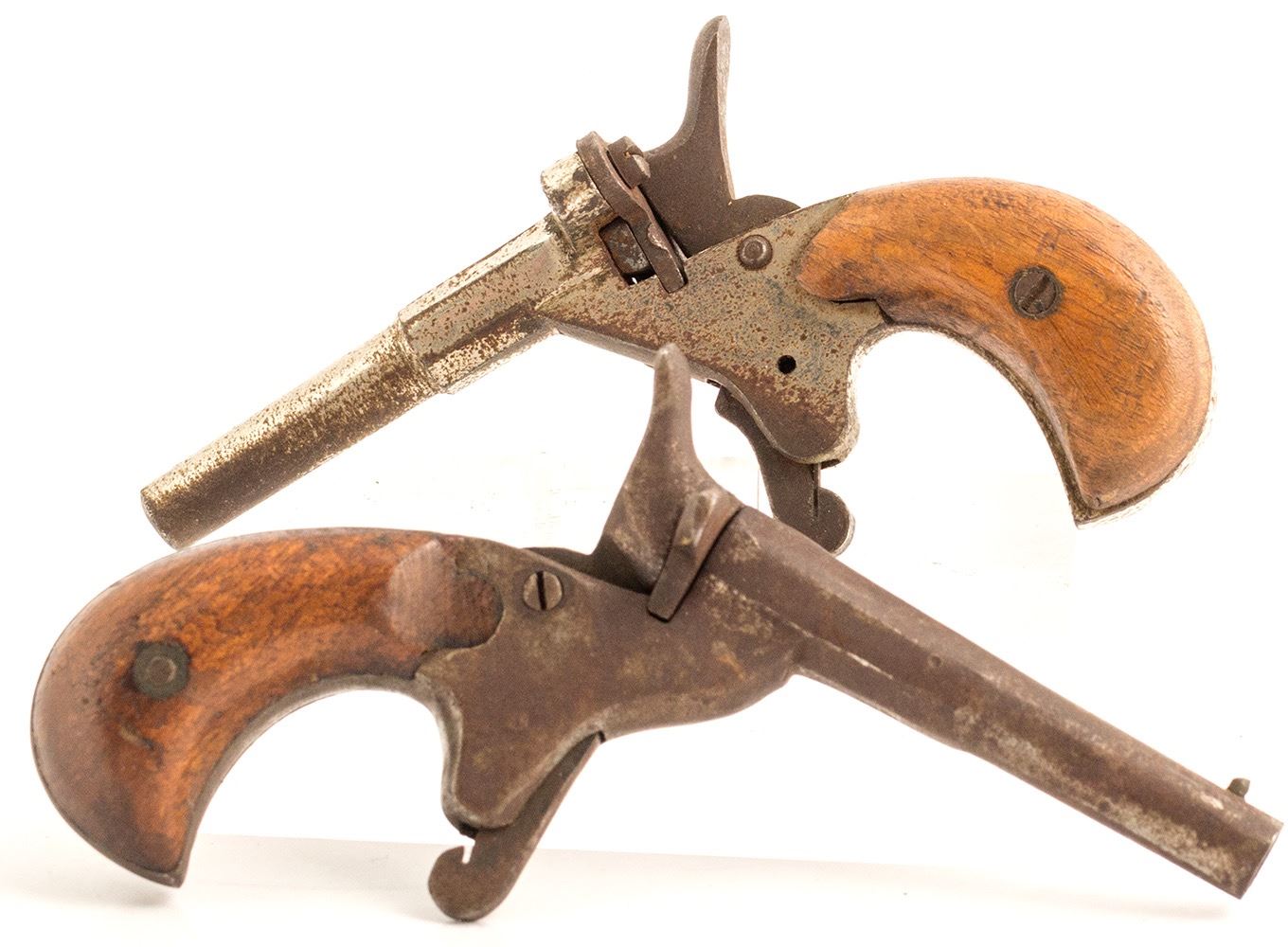 This is a pair of Belgian made .22 cal. rim-fire single shot pistols. c 1875. The first is nickel plated with the barrel plugged. A flash hole on the top of the barrel indicates this may have been converted to a starter pistol. It has bird-head grips, a spur trigger and octagon to round barrel. The second pistol is not plated with walnut grips, heavy patina octagon to round barrel and spur trigger. State: City: Date: ID# 49610