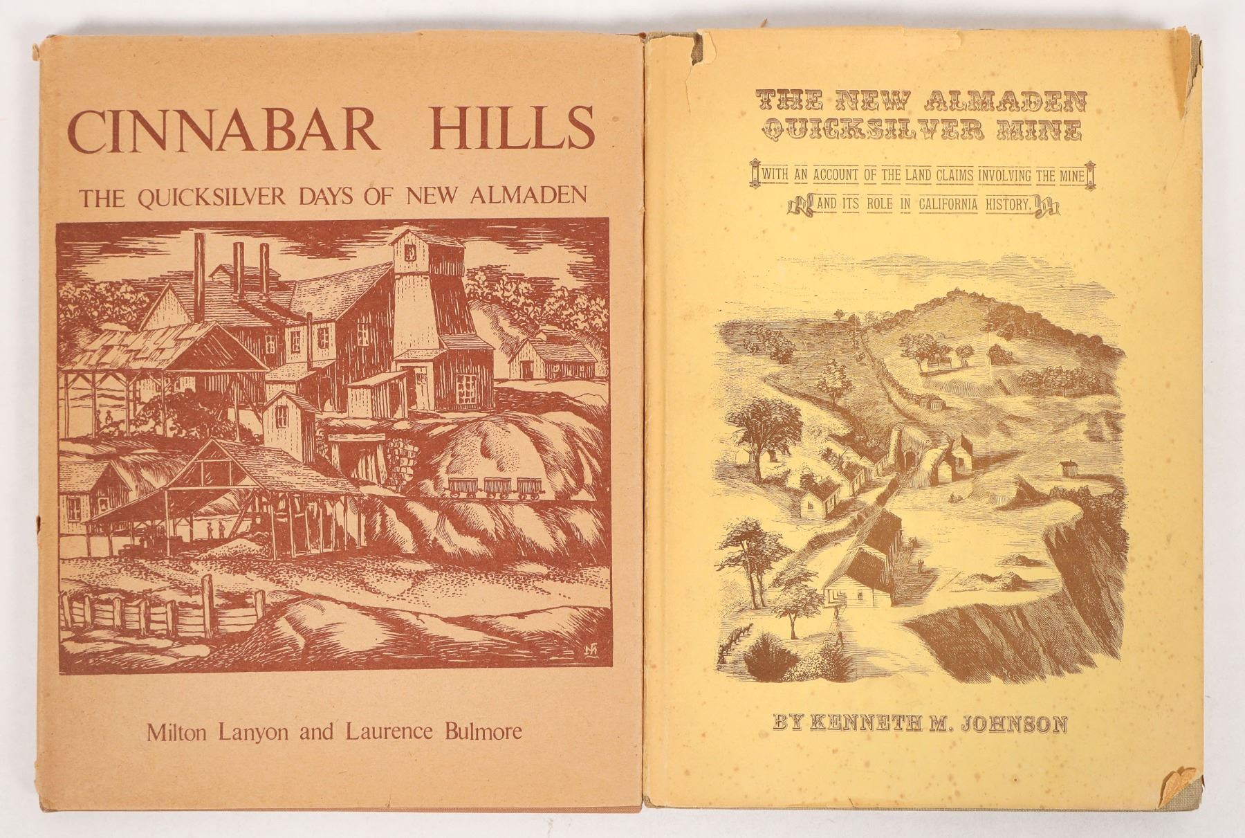 A pair of books on the California mercury mining industry: 'The New Almaden Quicksilver Mine (1963) by Kenneth M. Johnson and 'Cinnabar Hills: The Quicksilver Days of New Almaden' (1967) by Milton Lanyon and Laurence Bulmore. Both books discuss the history of the New Almaden Quicksilver Mine and its role in the greater history of the state. The books themselves are in good condition, but their paper dustjackets are worn; the Kenneth M. Johnson book's jacket has some sizeable tears.