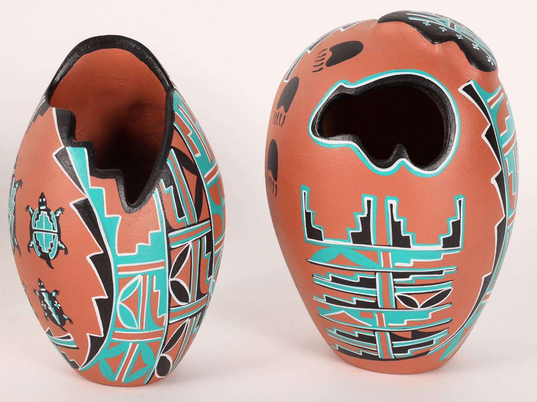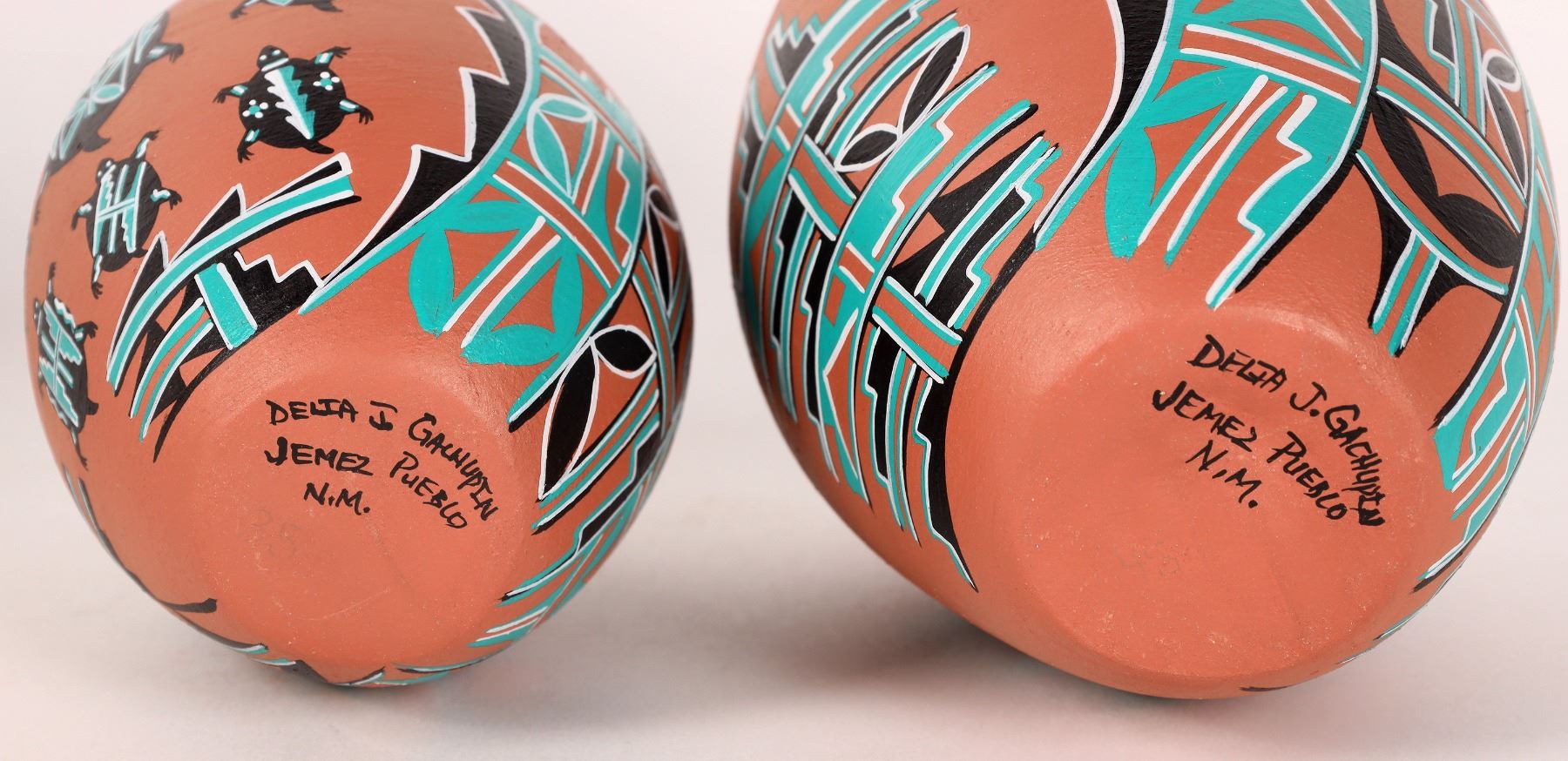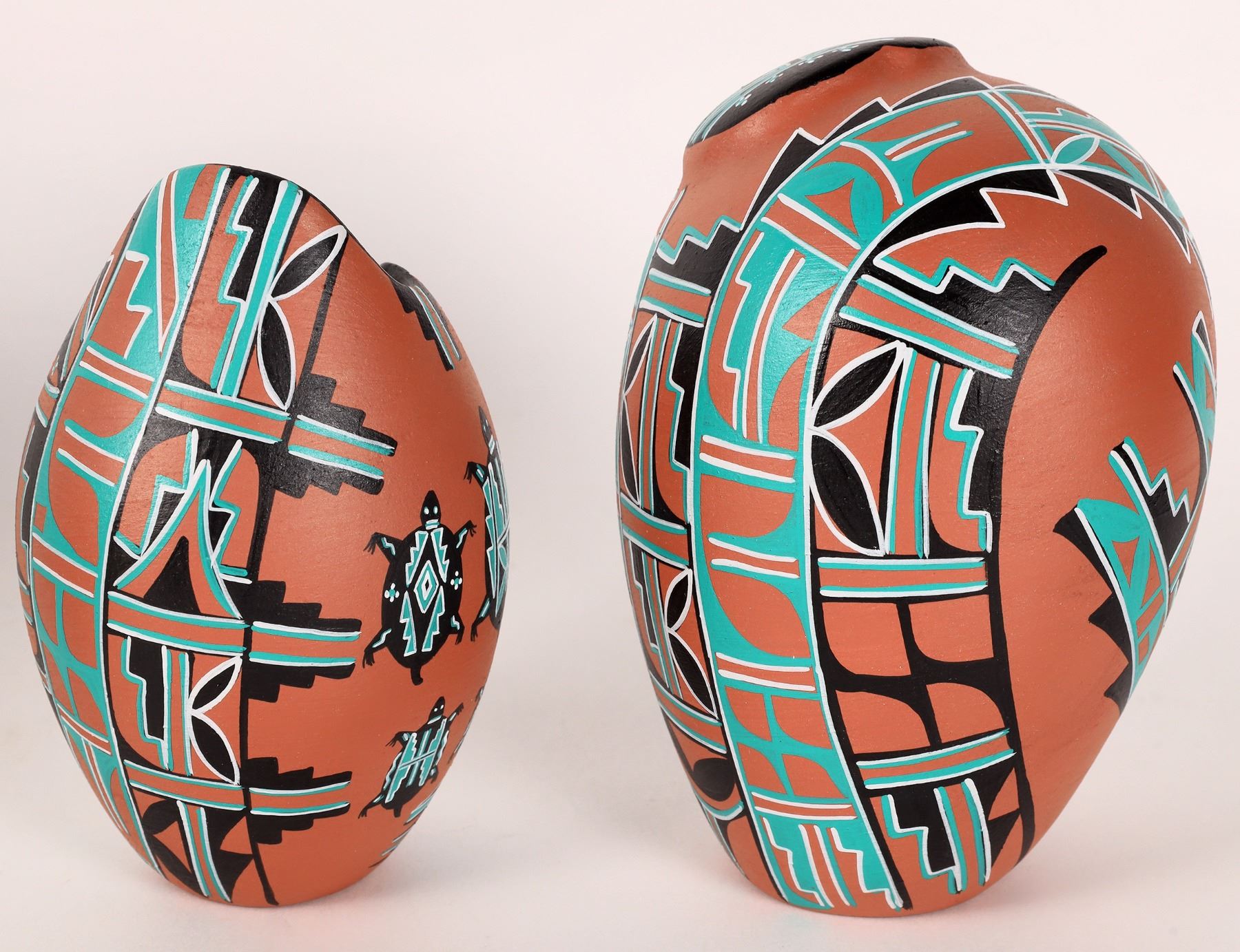 Jemez potter, Delia Gachupin specializes in redware bowls, vases and ornaments. Hand painted red clay depicting a bear fetish cutout and traditional designs in black white and Turquoise on one and Turtle designs on the other. pot 1, 6"x 3.5; pot 2, 5" x 3".