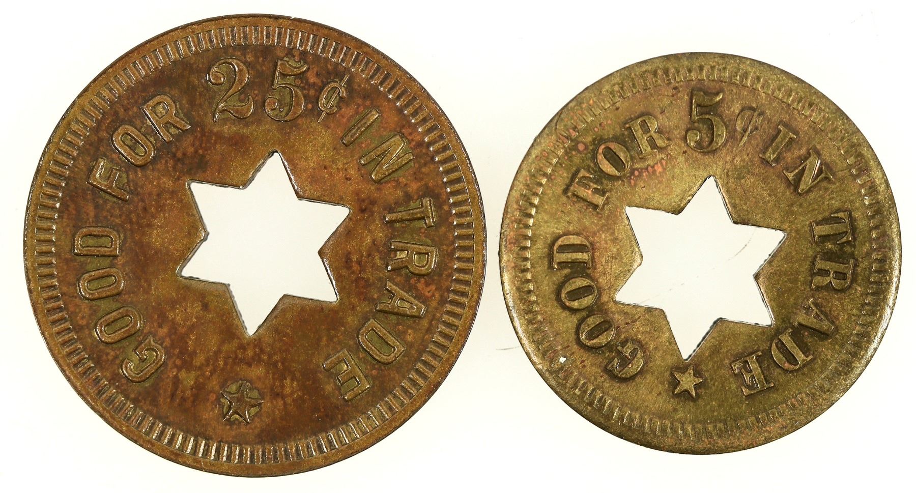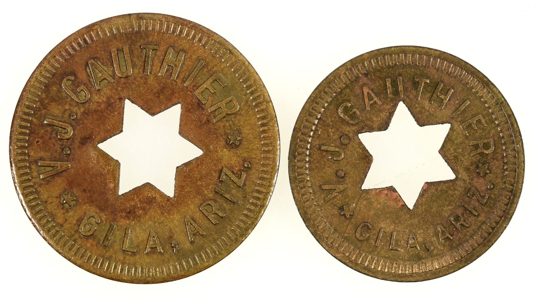 A pair of brass trade tokens from V.J. Gauthier of Gila Bend, Arizona. One 5¢ token, one 25¢ token. Unique design with six-pointed star hole punched through center.