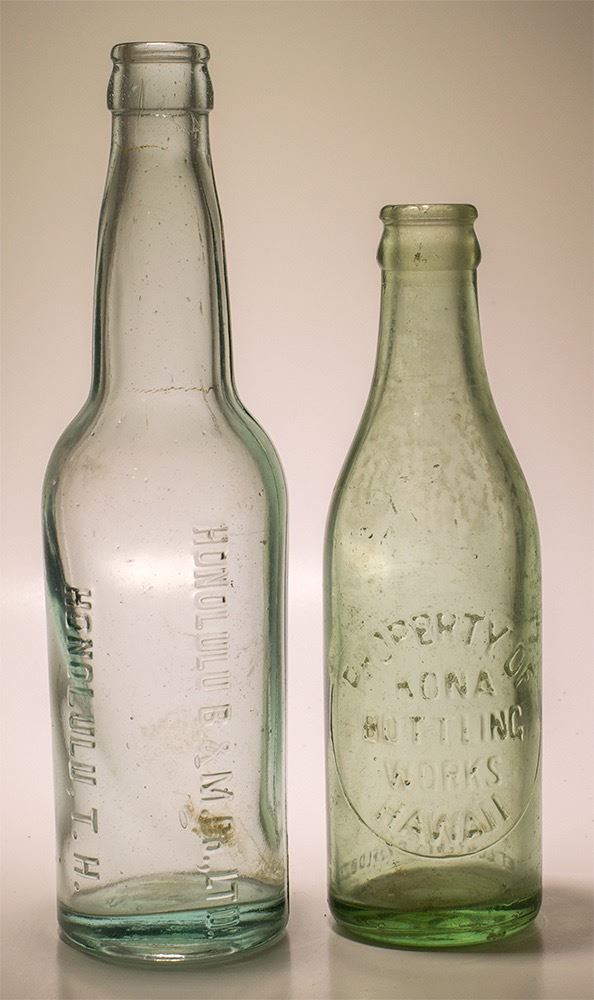 Pair of Hawaii soda bottles. Tall crowntop, Honolulu, B. & M. Co., Ltd, Honolulu T. H. The second bottle is a four piece crowntop soda Property of Kona Bottling Works, Hawaii . K B embossed on the bottom. Both bottles are aqua the second bottle has some surface wear and inside stain. City: State: Hawaii Date: Inventory# 40955