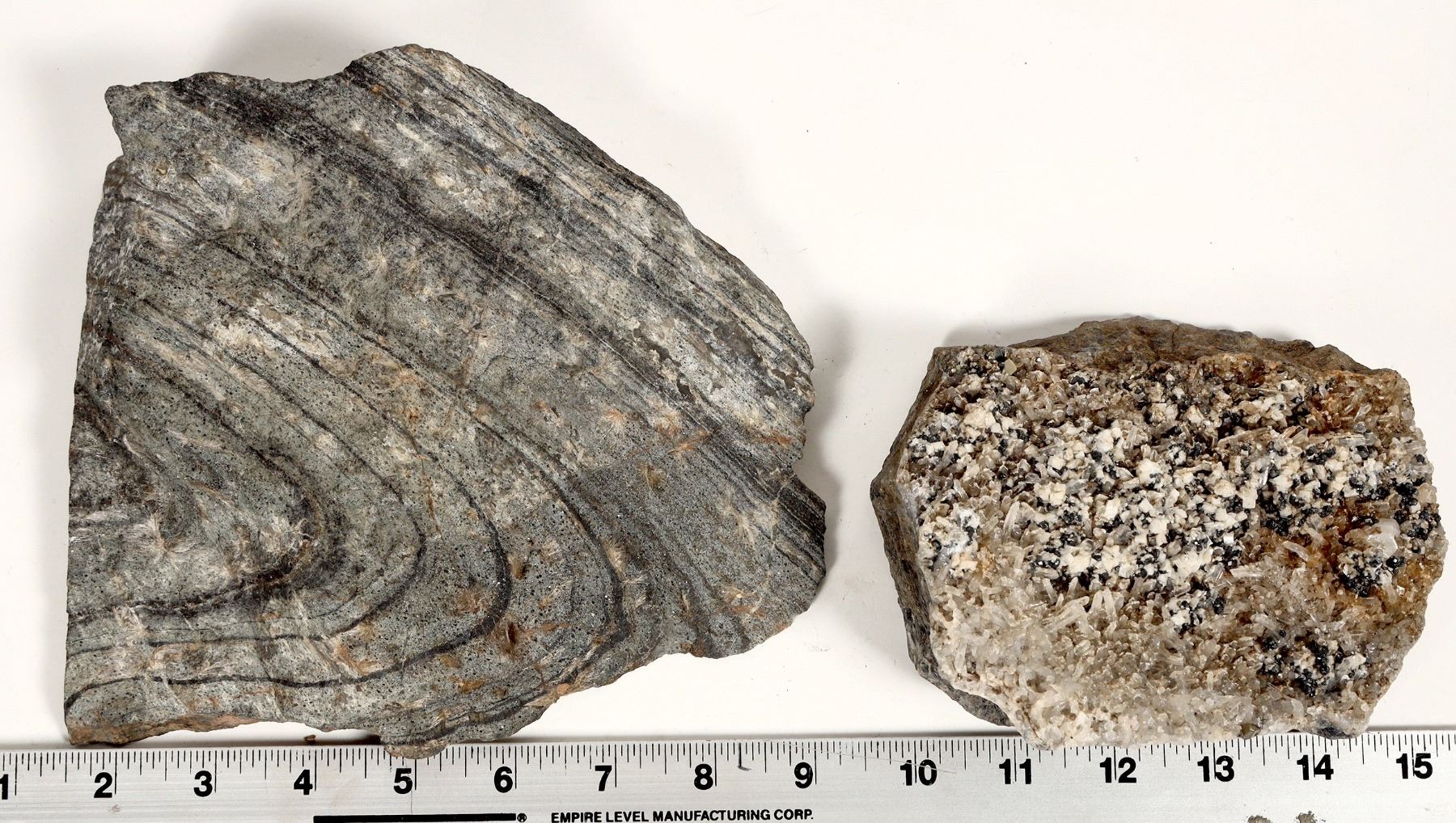 Two large Homestake Mine specimens. One is cut piece (probably from the Poorman Formation) showing intense folding and disseminated pyrite. The other shows Tertiary mineralization inside the Homestake Formation. Please see photos for dimensions.
