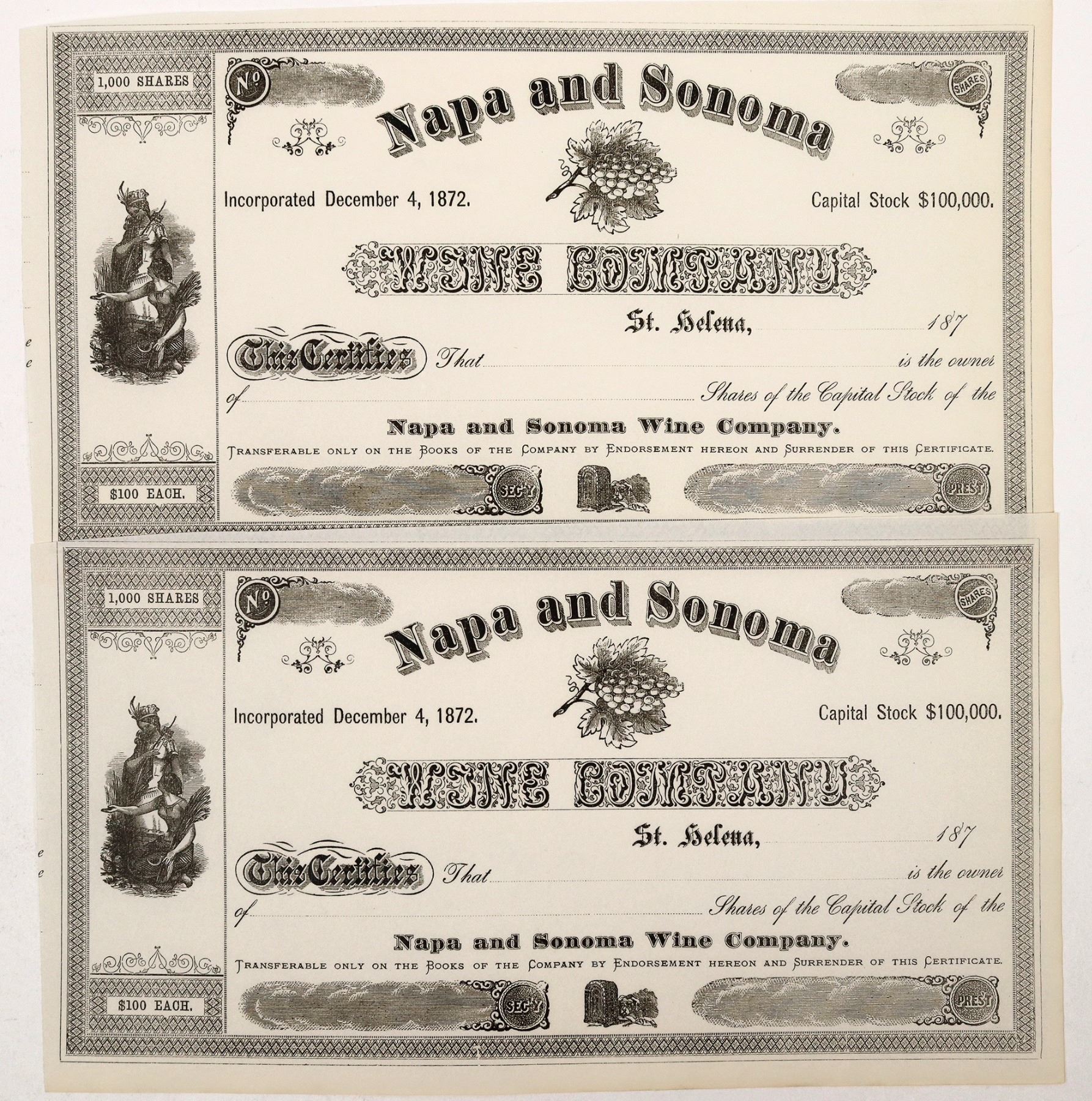Two unissued stock certificates for shares in the Napa and Sonoma Wine Company, dating from the 1870s. The decade from 1870 to 1880 was the first boom in the Napa wine industry, with an increase in wine production of almost 1000% from the birth of the industry in the 1850s (Statistic from Viticulture's Promised Land by Suruchi Mohan.) These certificates originate from this pivotal moment in California's wine history. They have interesting engraved vignettes of two figures gathering crops, as well as an engraving of a bunch of grapes; both are in excellent condition.