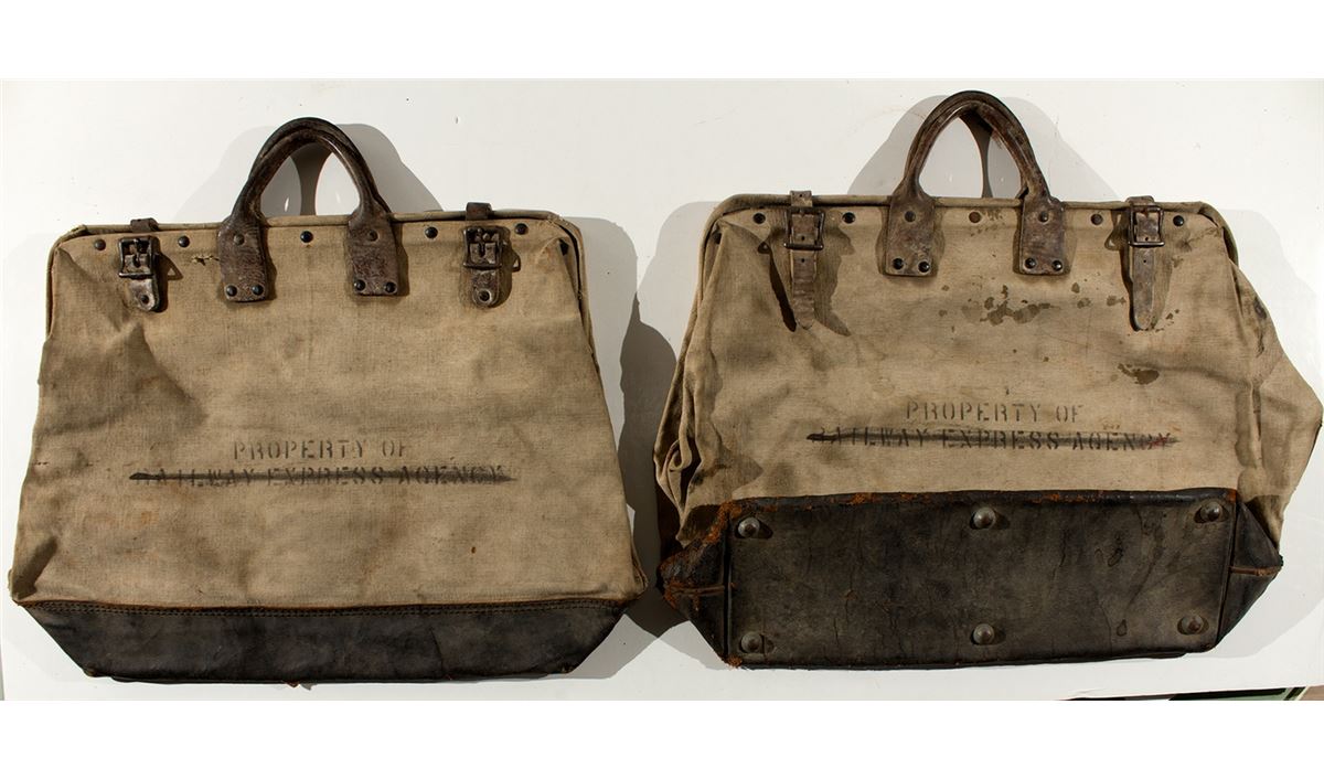 Canvas. Non-locking. Both stamped "Property of Railway Express Agency" Stains on canvas. Heavily used. 15" x 23" with a 6" x 17" leather bottom. (Ex-Parker Lyon Pony Express Museum)