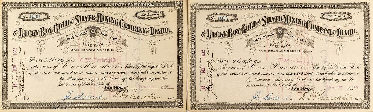 Inc. in New York, Location: Saw Tooth District, Alturas County. Certificates No. 1065 & 1068. Not cancelled. Both issued Dec. 12, 1882 to C.W. Cortright. Signed by R.E. Reuster as president and J.Jay Pardee as asst secy. Operated the Lucky Boy mine in Jake's Gulch, off Beaver Creek, 25 miles east of Atlanta. Generally a silver producer. Ore was shipped to the Vienna mill, a few miles from the mine. Both stocks are very clean, with minor toning on edges. (Prag Collection) City: Alturas County State: Idaho Date: 1882 hwac# 34054