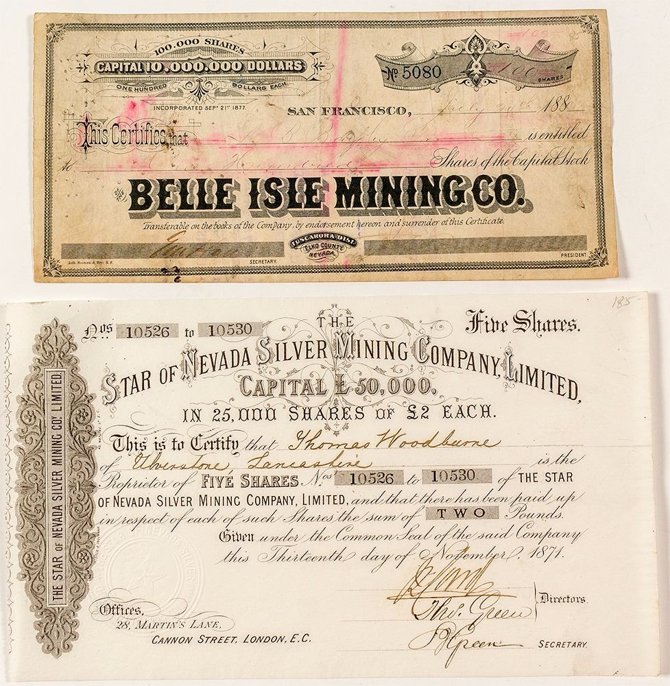 Tuscarora District, Elko County, Nevada. 1) The Star of Nevada Silver Mining Company, Limited. Issued in London, November 1871. Five shares to Thomas Woodburne. Signed by the directors and secretary. Not cancelled. 5.5" x 9.5" Bent upper left corner. 2) The Belle Isle Mining Co. No. 5080, issued for 100 shares in 1880. Signatures very faint. Heavy staining and soiling to cert. Britton & Rey. 4" x 8.75" (Prag Collection) State: Nevada City: Tuscarora Date: 1871 & 1880 FHWAC#: 34929