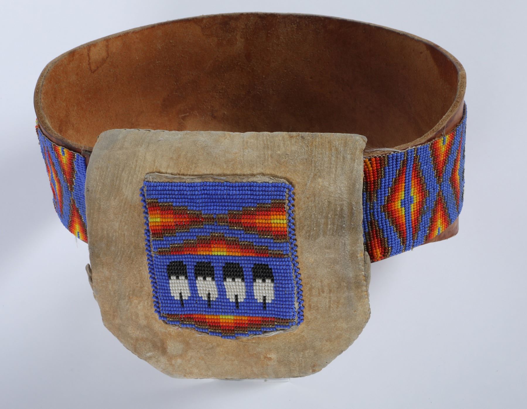 Colorful leather belt with blue, black, white and orange beading. Made by Ronda Cochamp. Front buckskin cover with beaded feathers. Bought from Daniel Toby.