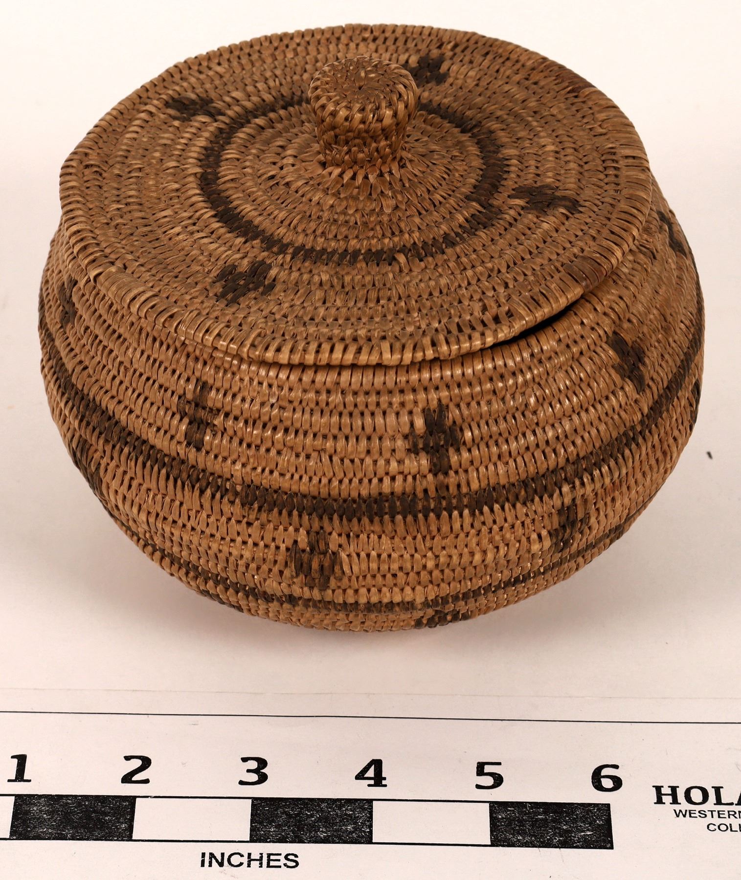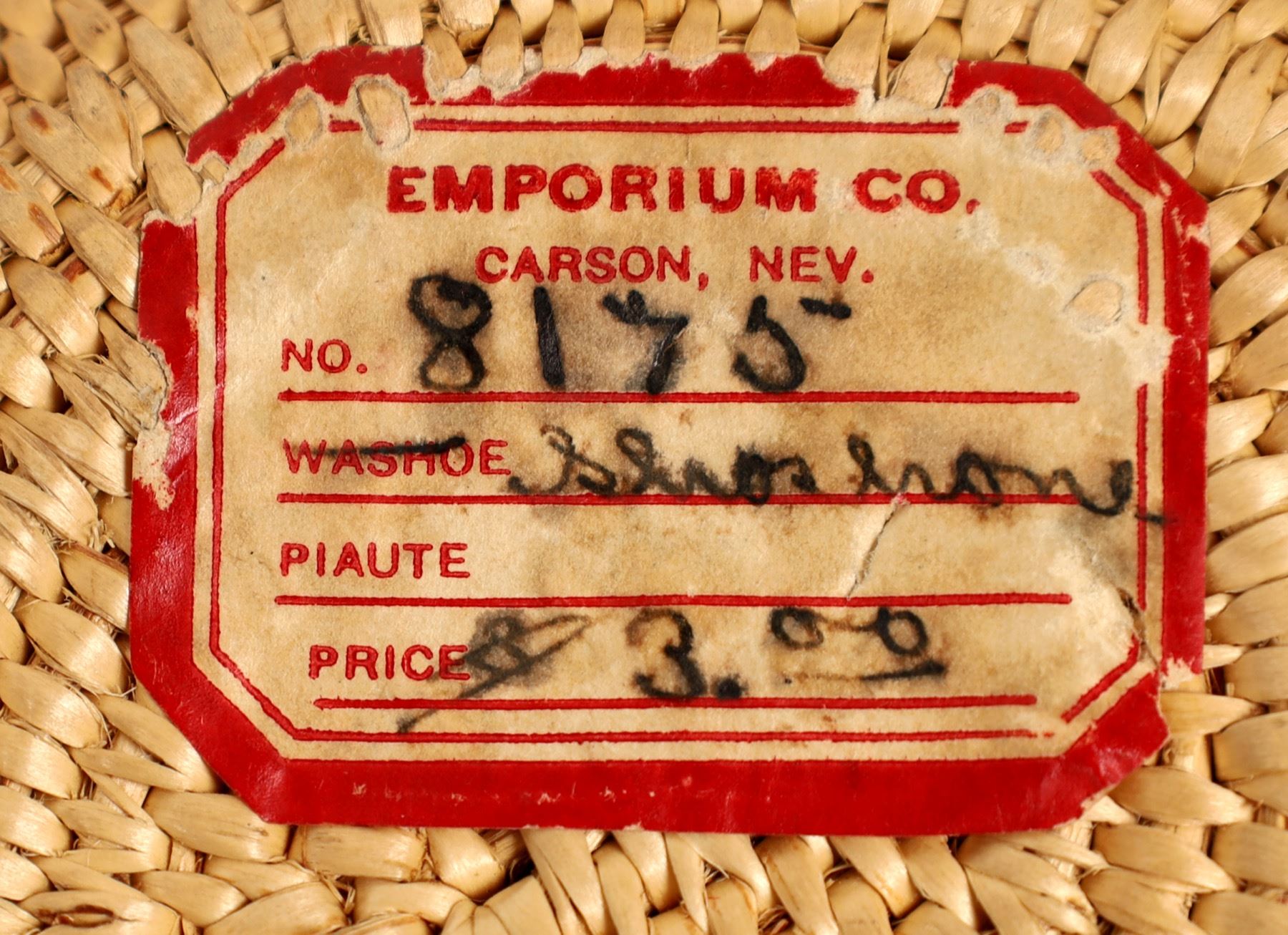 Renowned Native American basket weaver Dat So La Lee of the Washoe Tribe in northern Nevada sold many of her finest works at The Emporium in Carson City, Nevada, which was owned and operated by Amy and Abram Cohn. The Cohn's quickly recognized the quality of Dat So La Lee's basketry and documented every item that she produced from 1895–1925. Most if not all of the approximately 120 documented baskets were sold at The Emporium Co. This lidded basket still has the Emporium Co. label affixed to the bottom (see close-up photo). We cannot know for certain that it was made by Dat So La Lee, however. The construction is of dried willow shoots, the darker material likely dyed in an iron-bearing water solution containing acorns. It is approx. 6 inches in diameter and 5 inches tall to the top of the knob on the lid. It is in excellent condition. See photos for details on construction and condition.