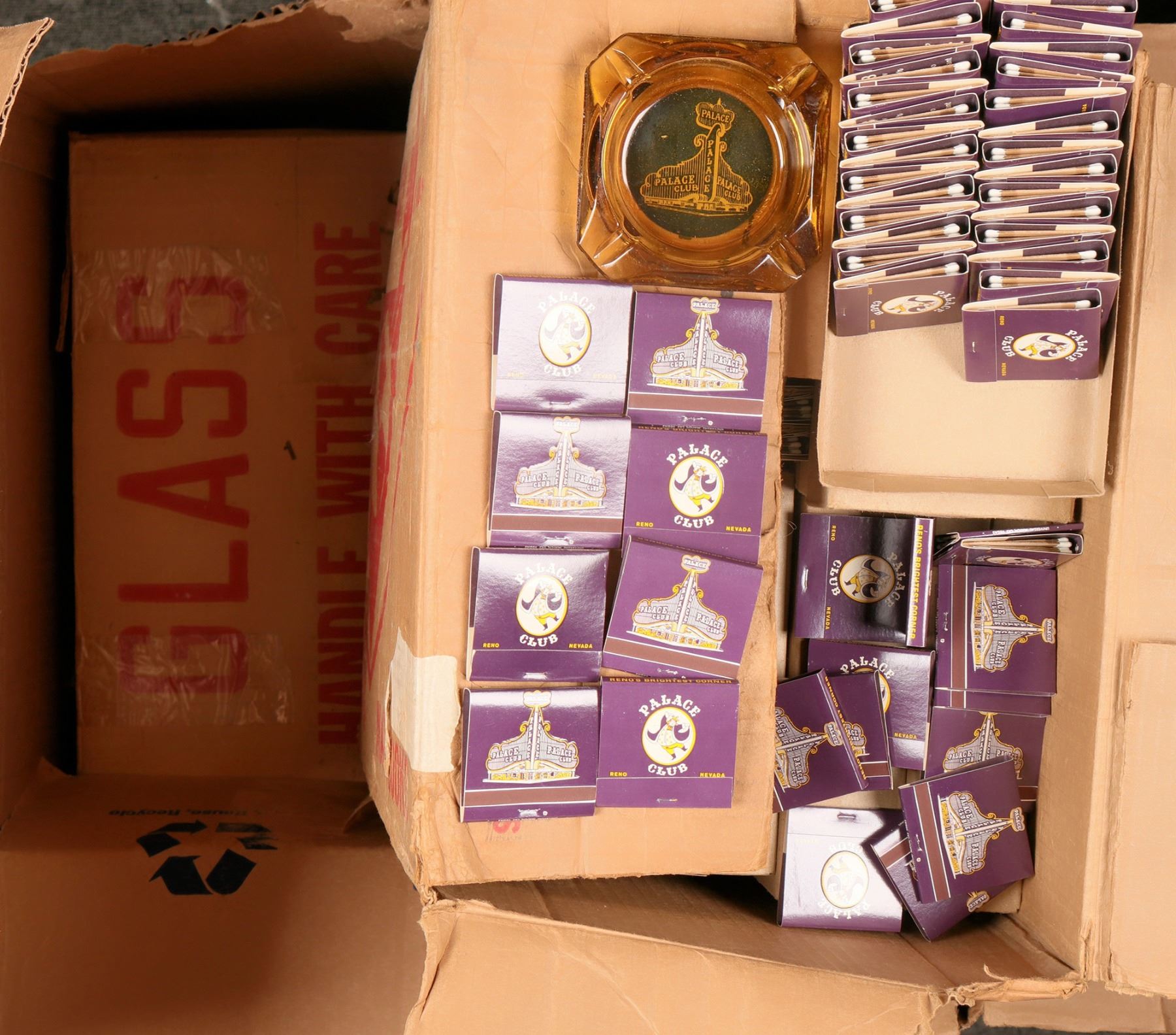 About 150 brand new, never out of the box ash trays and huge box of unused matchbooks, maybe 1000+. c1933-1976, probably c1970 for this material. Historical!!