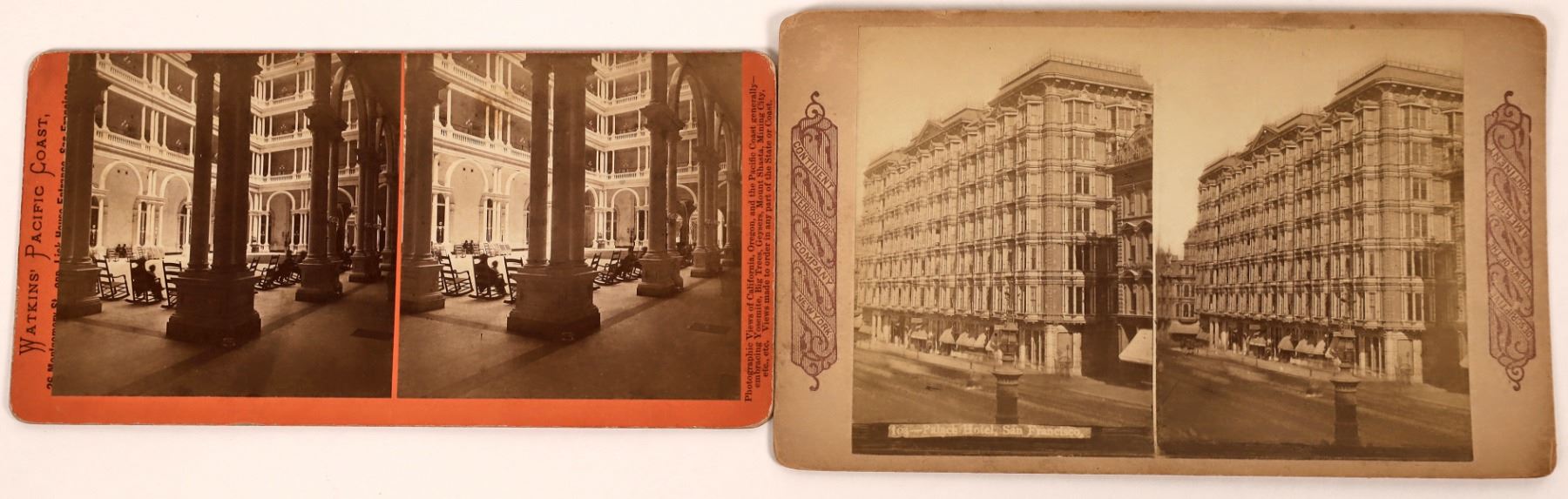 Interior view is Watkins and the exterior view is Continent Stereoscopic Company. The Palace Hotel was built by San Francisco banker and entrepreneur William Chapman Ralston who heavily depended on his shaky banking empire to help finance the $5 million project. William Sharon ended up in control of the hotel after the collapse of the Bank of California and Ralston's suicide. With 755 guest rooms, the original Palace Hotel (also known colloquially as the "Bonanza Inn") was at the time of its construction the largest hotel in the Western United States. The hotel burned after the great earthquake of 1906. San Francisco California