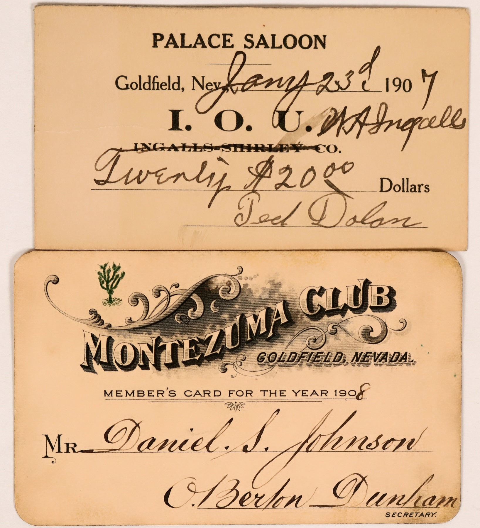 Palace Saloon I.O.U. for $20 from W. A. Ingalls (Sheriff) signed by Ted Dolan. Member's Card for the Year 1908 issued to Mr. Daniel S. Johnson by O. Berton Dunham for the Montezuma Club. Ex: Ron Lerch Collection.