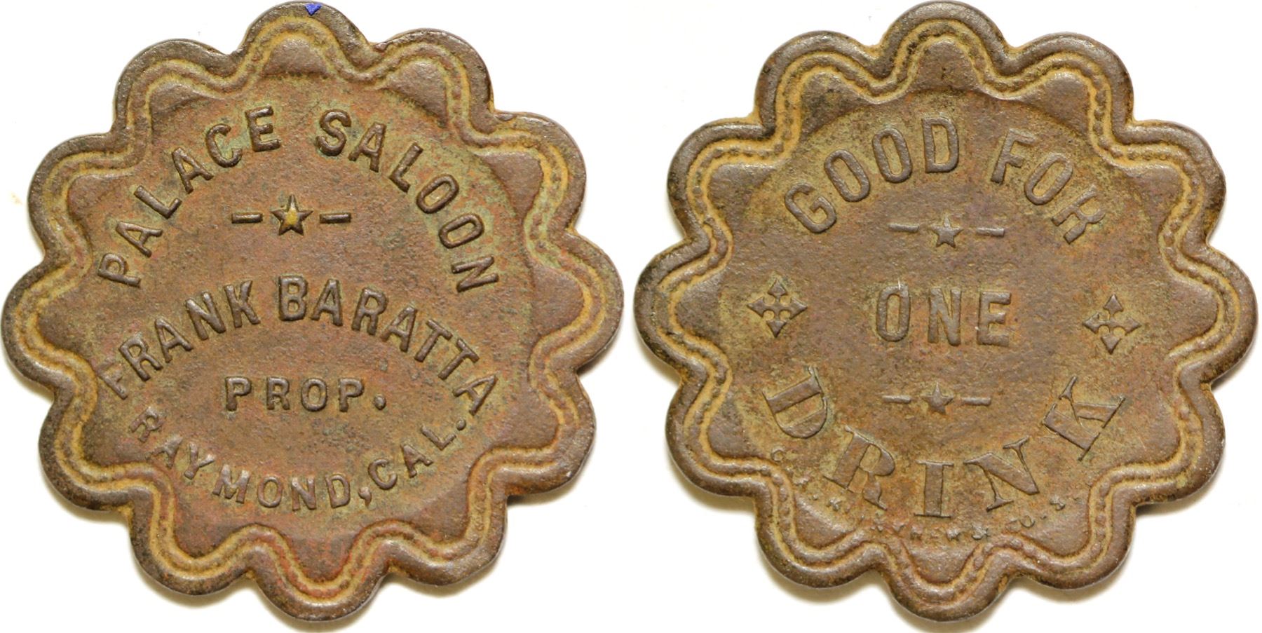 Obv.: Palace Saloon / Frank Baratta / Prop. / Raymond, Cal.; Rev.: Good For / One / Drink. Br., scalloped, 25 mm. State: California City: Raymond Date: HWAC# 84325