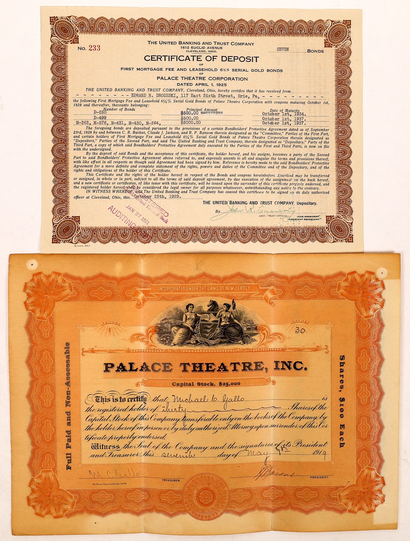 Two stock certificates issued by the Palace Theatre that was built in 1919, the year that one of these certificates was issued. The same certificate is issued to one of the founders, Michael Gallo, who financed the theatre that started as a vaudeville house and later showed silent and sound films. Please see photos for more detail and condition.