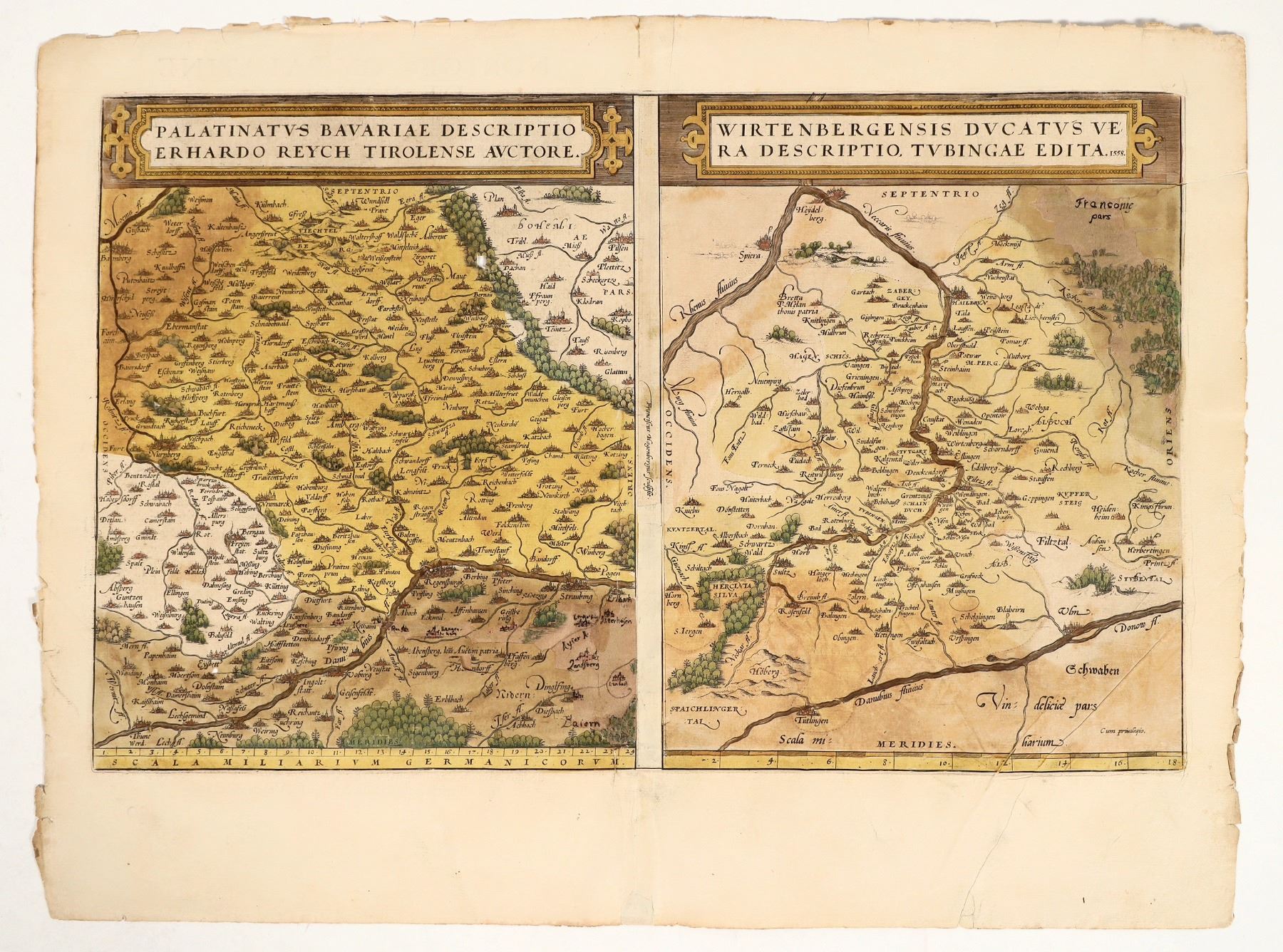 1558 map of Bavaria , cartography style, hand colored, copper-engraving, written in Latin. Story on back of map. 16 x 21.5"