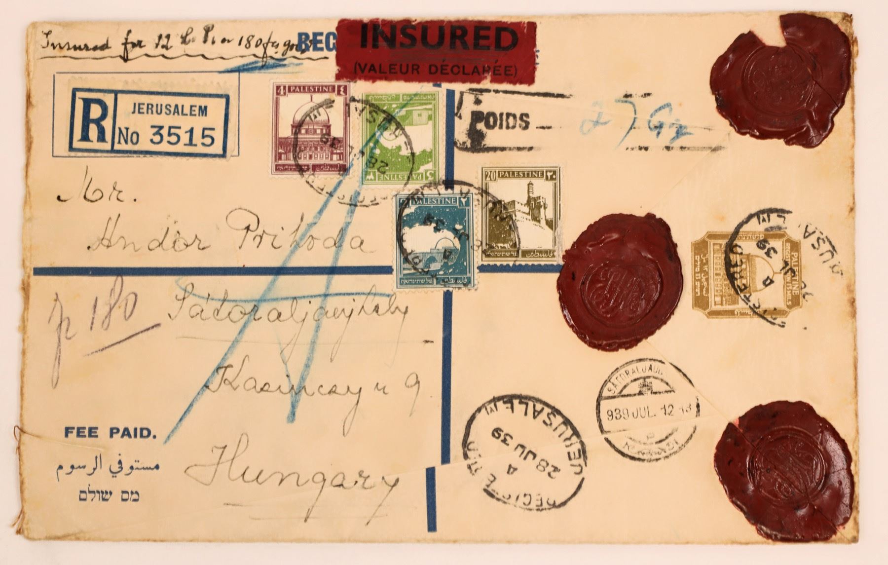 This postal cover is from Jerusalem, Palestine of 1939. Heavily wax sealed, cancel stamped and insured. 5 in. X 8 in. Please see photos for details. City: State: Date:1939