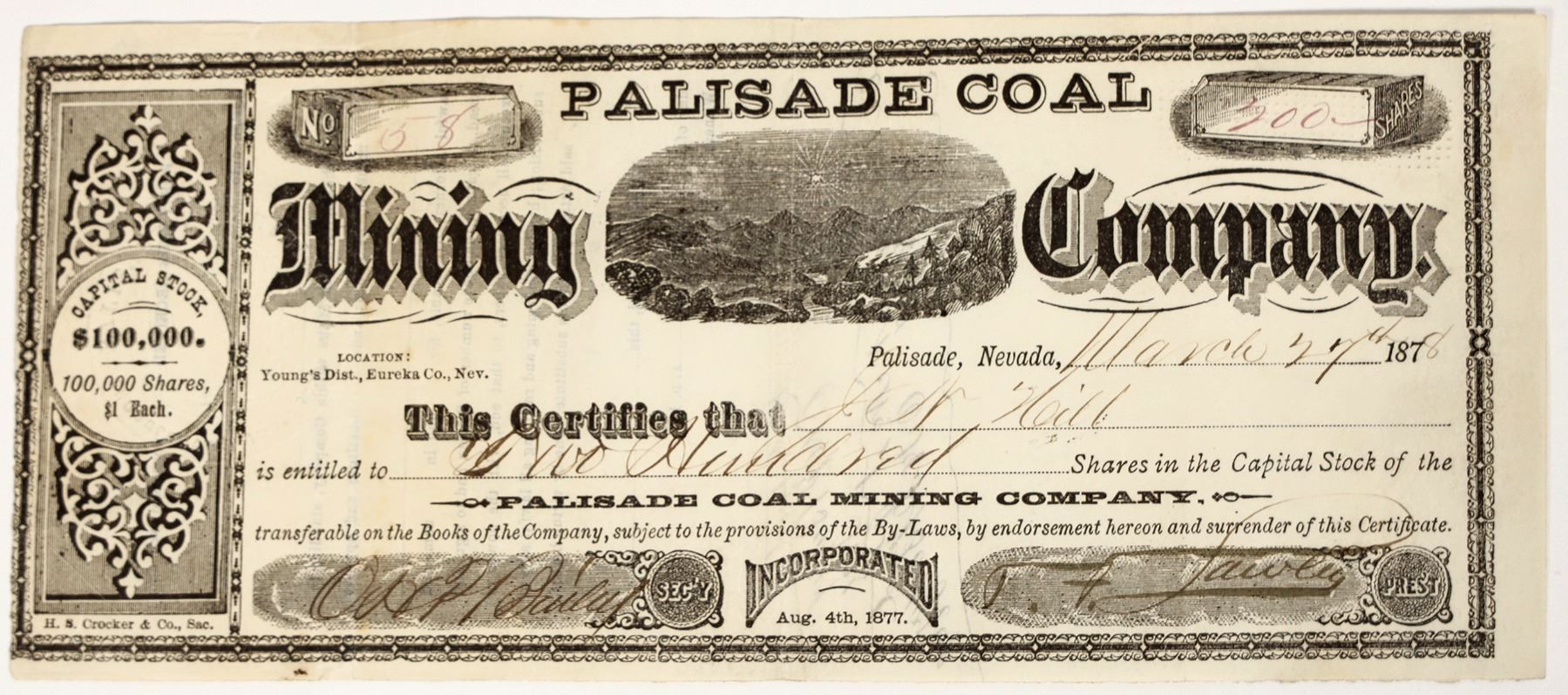 Very rare; we haven't sold one of these in over 11 years. Inc. August 1877. No. 58, issued for 200 shares to JN Hill in Palisade, Nevada, 1878. Signed by president TF Lawlor and secretary Bailey. Not cancelled. Mountain vignette. HS Crocker & Co. Folds. 4 x 9.5" One of the rare coal deposits in Nevada, located 8 miles northeast. FH notes that it was low grade. In August 1877, it was reported the railroad there had ordered ten tons of coal for a trial. JN Hill was agent for the Eureka & Palisade Railroad.