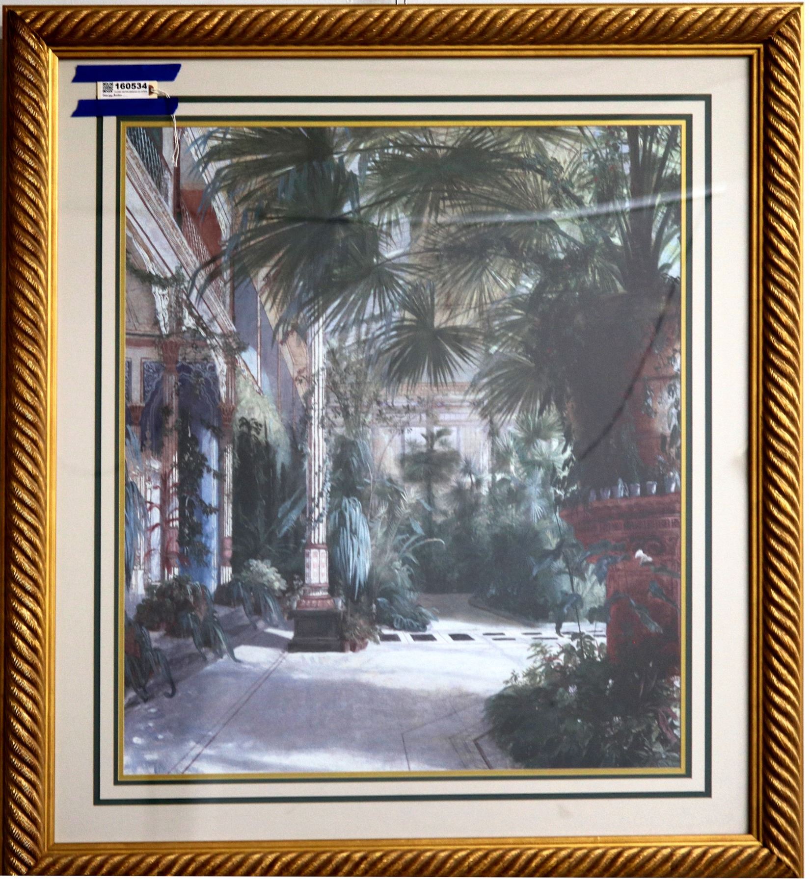 This print is of the Palm House in Kew Gardens, London, England. The print depicts the Palm House as it appeared in the 1880's with botanical palms in large pots. Currently, the building still houses palms however the potted plants are now planted at floor level for much larger root patterns that they all needed. Framed at 44 in. wide X 49 in. high. Allow for extra shipping.