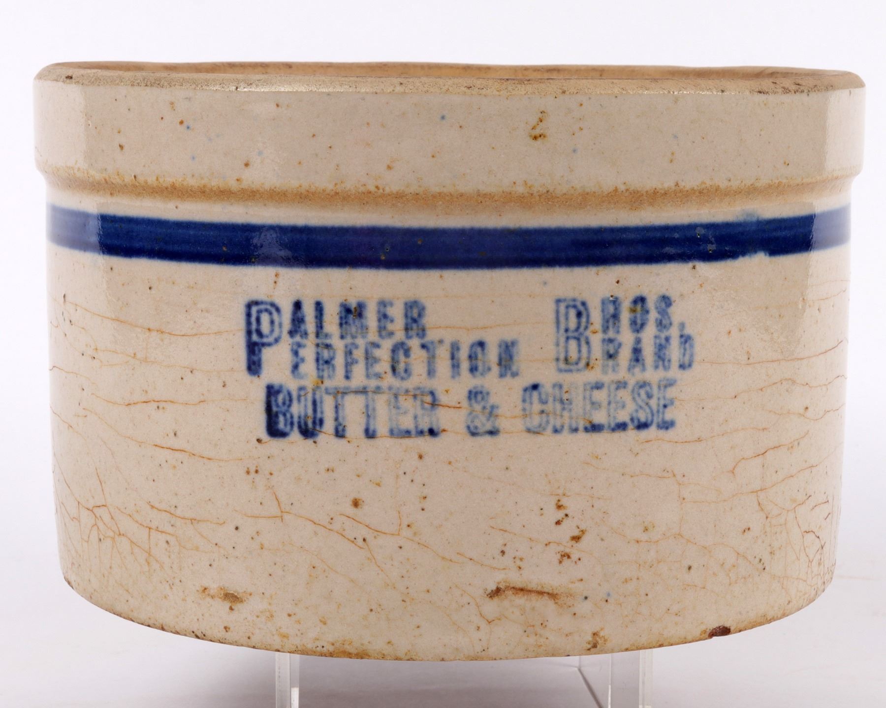 Palmer Bros./Perfection Brand/Butter & Cheese. 4.5x7.5". 3" crack and glaze spiderwebbing.
