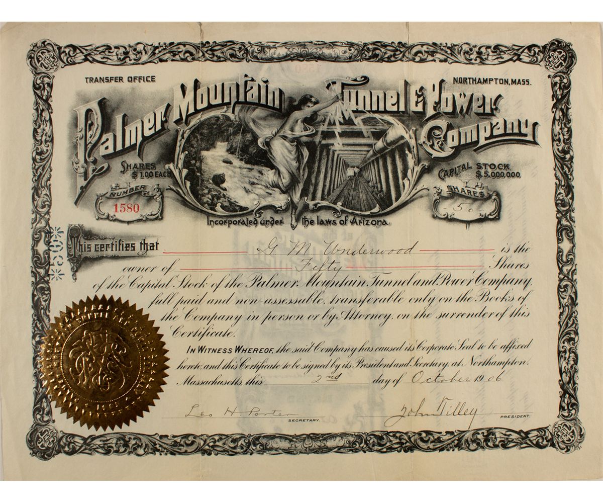 Stunning vignette! Inc. in Arizona. No. 1580. Issued for 50 shares to G.M. Underwood on Oct. 2, 1906. Signed by John Tilley (president) and Leo H Porter (secretary). Gorgeous vignette of allegorical woman, holding lightning bolts, standing between a mine tunnel and a river. Folds and separation along folds. 12" x 9.5" According to EMJ Volume 83, the company completed the hydroelectric power plant on Touts Coule Creek in 1905 and were advancing a tunnel past 4,000 feet into Palmer Mountain. Prag Collection