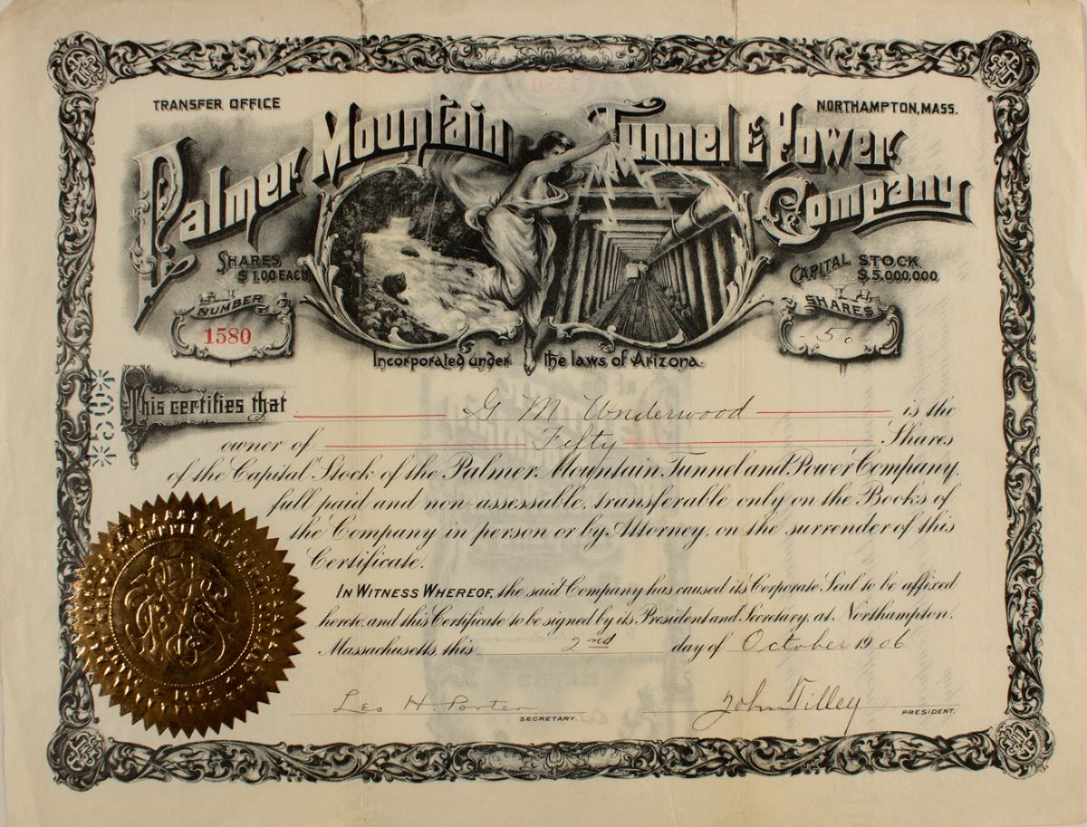 Stunning vignette! Inc. in Arizona. No. 1580. Issued for 50 shares to G.M. Underwood on Oct. 2, 1906. Signed by John Tilley (president) and Leo H Porter (secretary). Gorgeous vignette of allegorical woman, holding lightning bolts, standing between a mine tunnel and a river. Folds and separation along folds. 12" x 9.5" According to EMJ Volume 83, the company completed the hydroelectric power plant on Touts Coule Creek in 1905 and were advancing a tunnel past 4,000 feet into Palmer Mountain. Prag Collection City: State: Washington Date: hwac# 22428