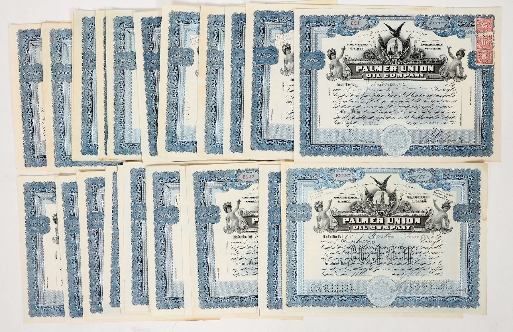 Approx. 25 stock certificates from the Palmer Union Oil Company, dating 1911-1913. All are issued and cancelled with a hole-punched cancellation. Small vignette of an oil derrick. Some toning/foxing and minor tearing throughout lot.