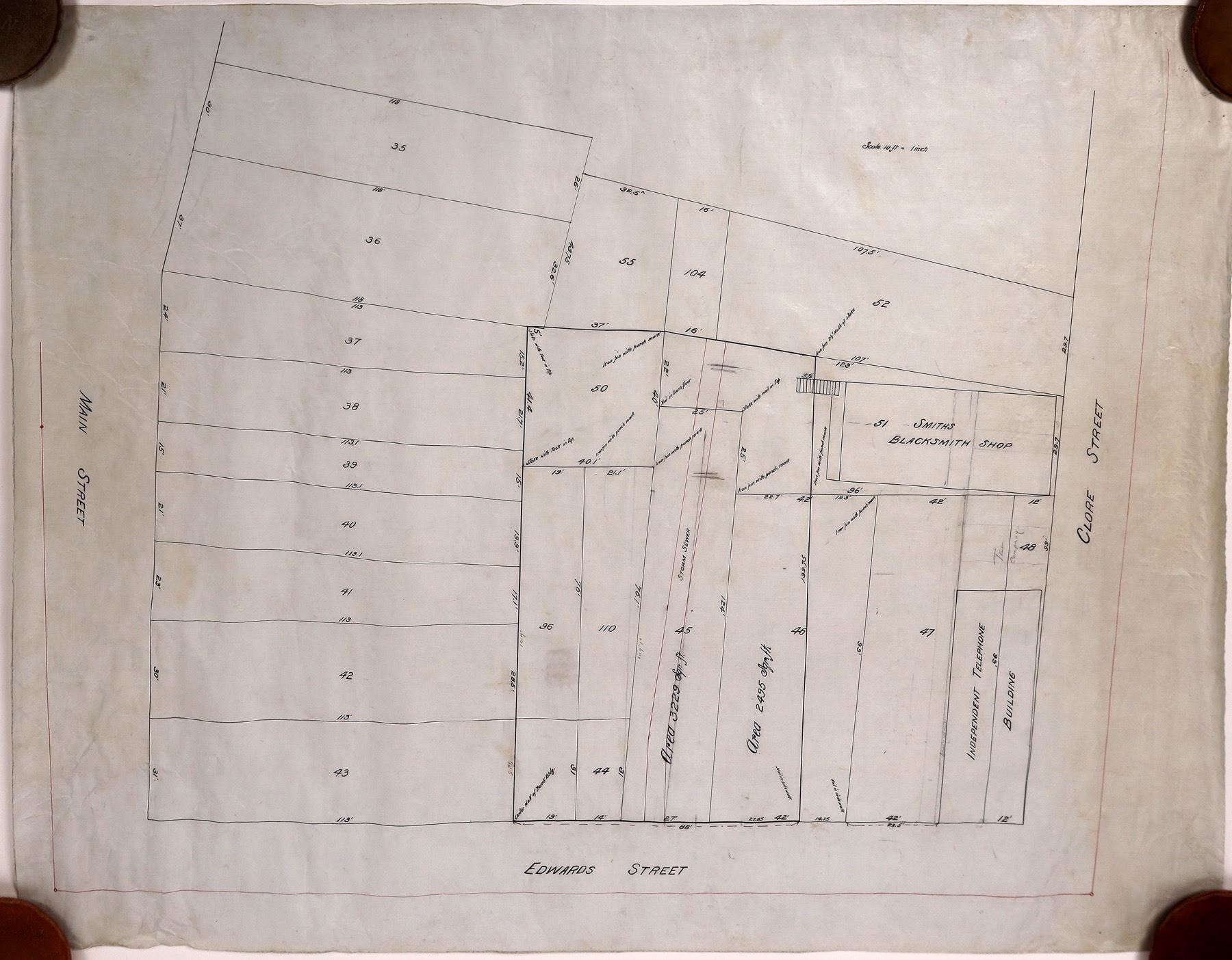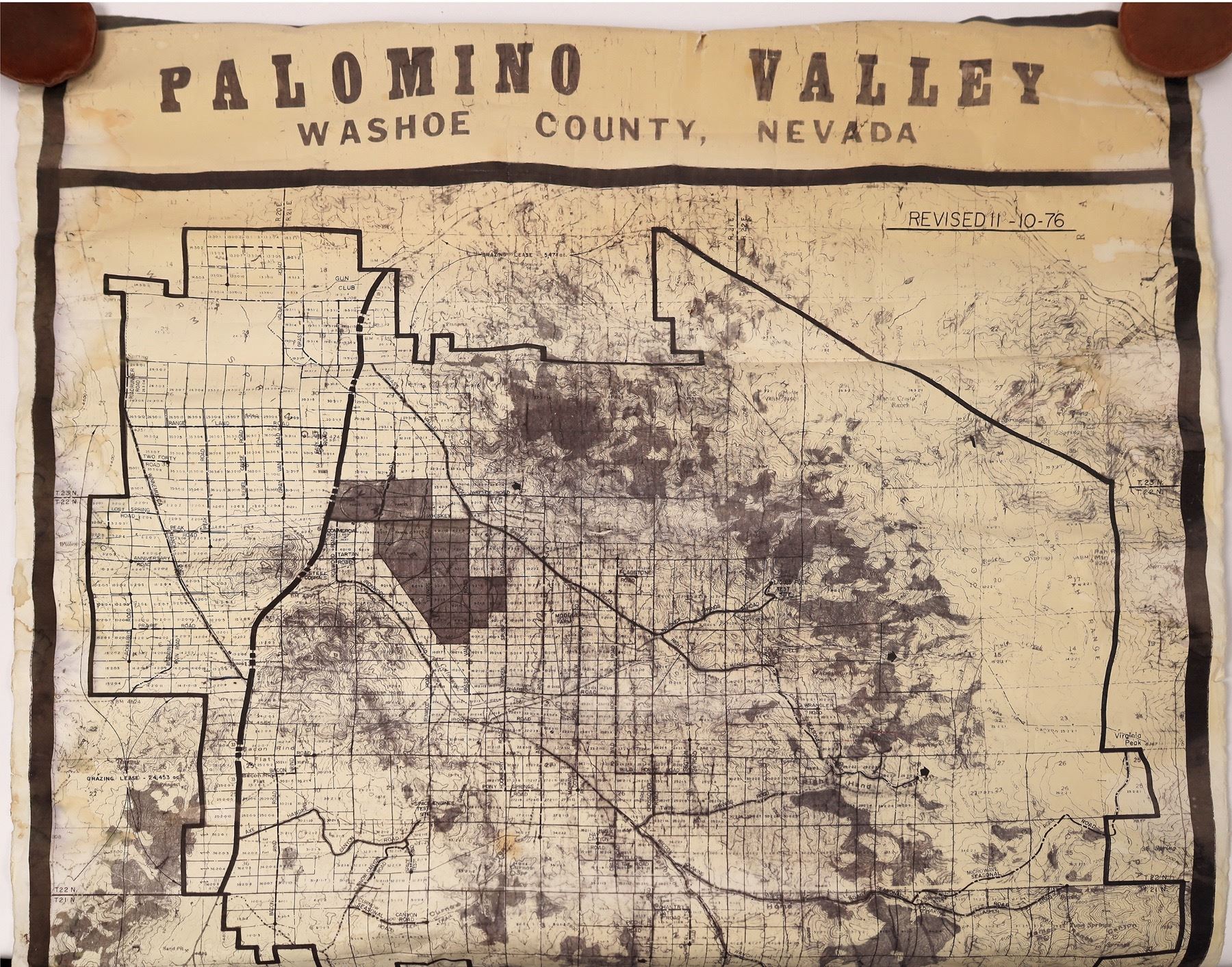Developer's b&w map of Palomino Valley, Washoe County, NV northeast of Reno between Sparks and Pyramid Lake where BLM has its Wild Horse and Burro roundup center. Legend Plan c1c, McCulloch Properties and Trico International, Drawing No P-9-56 dated 9-19-1975, map revised 10-1976. Legend shows existing and proposed roads and power lines as well as springs, wells and proposed irrigation ditches. Scale: 1" = 2000'. Dimensions: +/-68" x 42". Condition: one significant rip on bottom edge, all edges have some tearing, significant yellowing on top and bottom, appears to have been heavily used, rolled up.