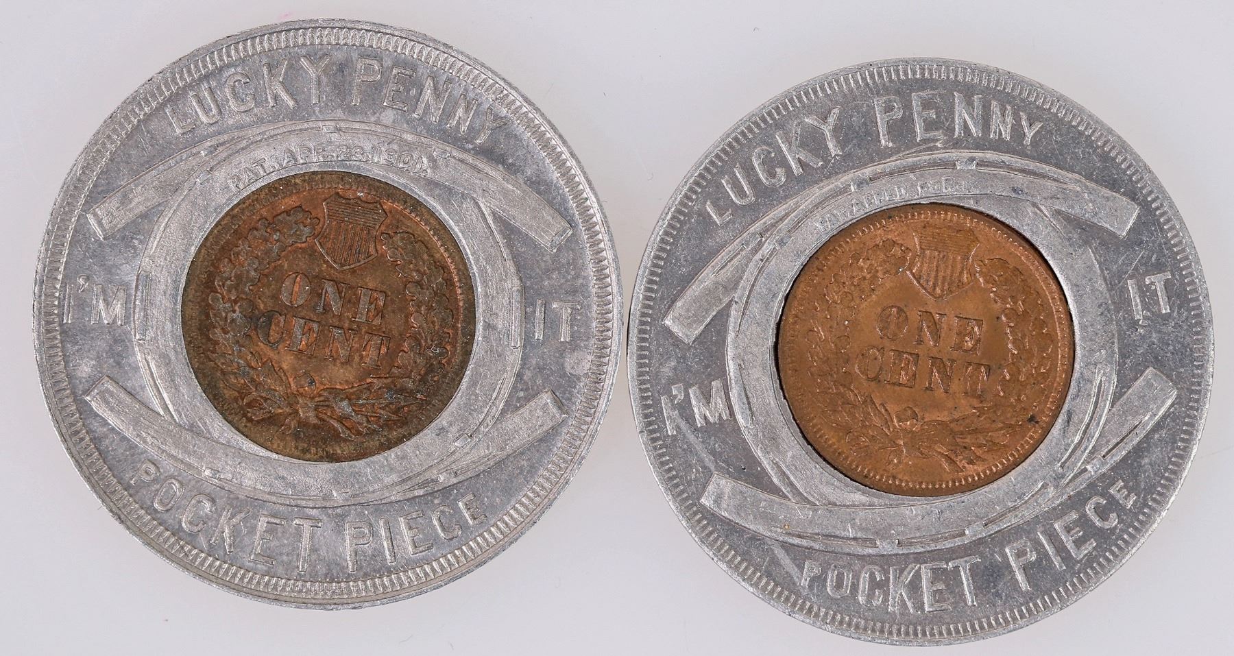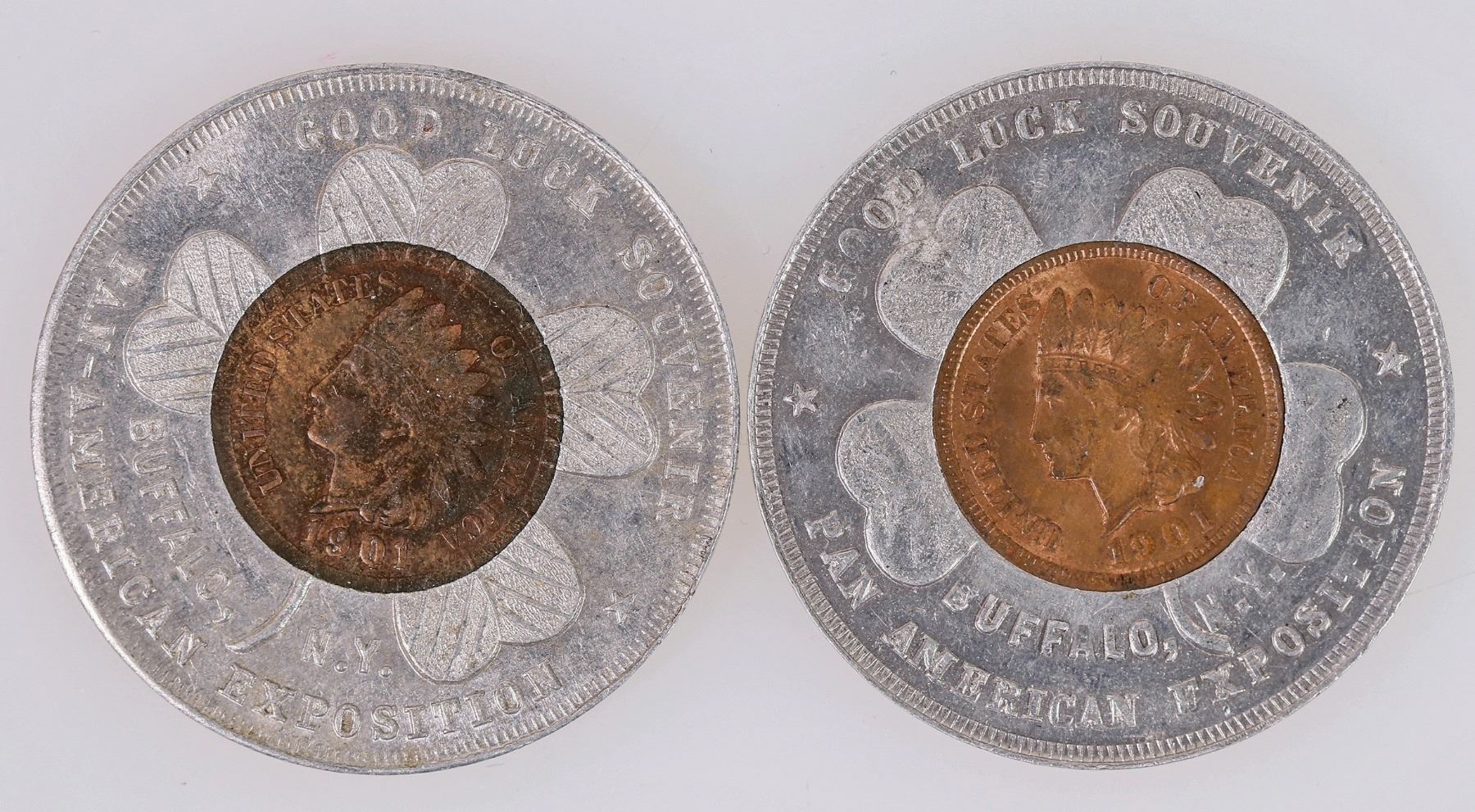 Two encased 1901 Indian Head pennies, in aluminum "lucky penny pocket piece" casing. 1901 Pan American Exposition Buffalo, New York. Cents are AU & EF condition.